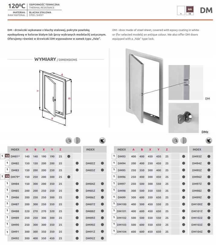 Металловые изменения доступны в размерах: от белых оцинкованных малованных прошково или от белых нердзевней в размерах от 140 x 140 мм до 600 x 600 мм о ksztalcie квадратовым и простоточным. Они оснащены монтажными венчиками и удобной ручкой на дверном полотне. Они также доступны в версии с замком Yale.