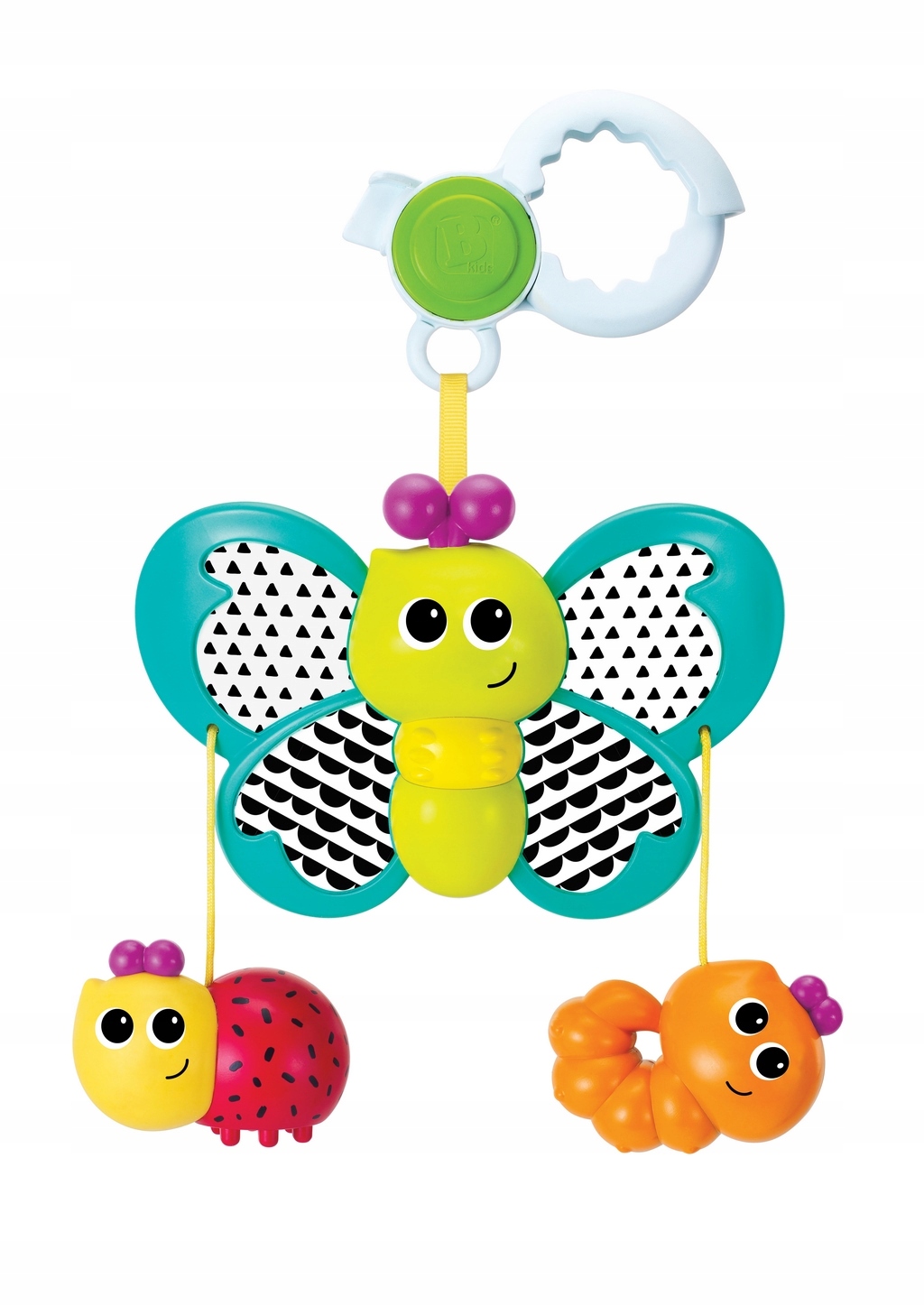 Красочная кулон бабочки с зажимом, благодаря которой его можно повесить на любую коляску, автокресло или рокер.