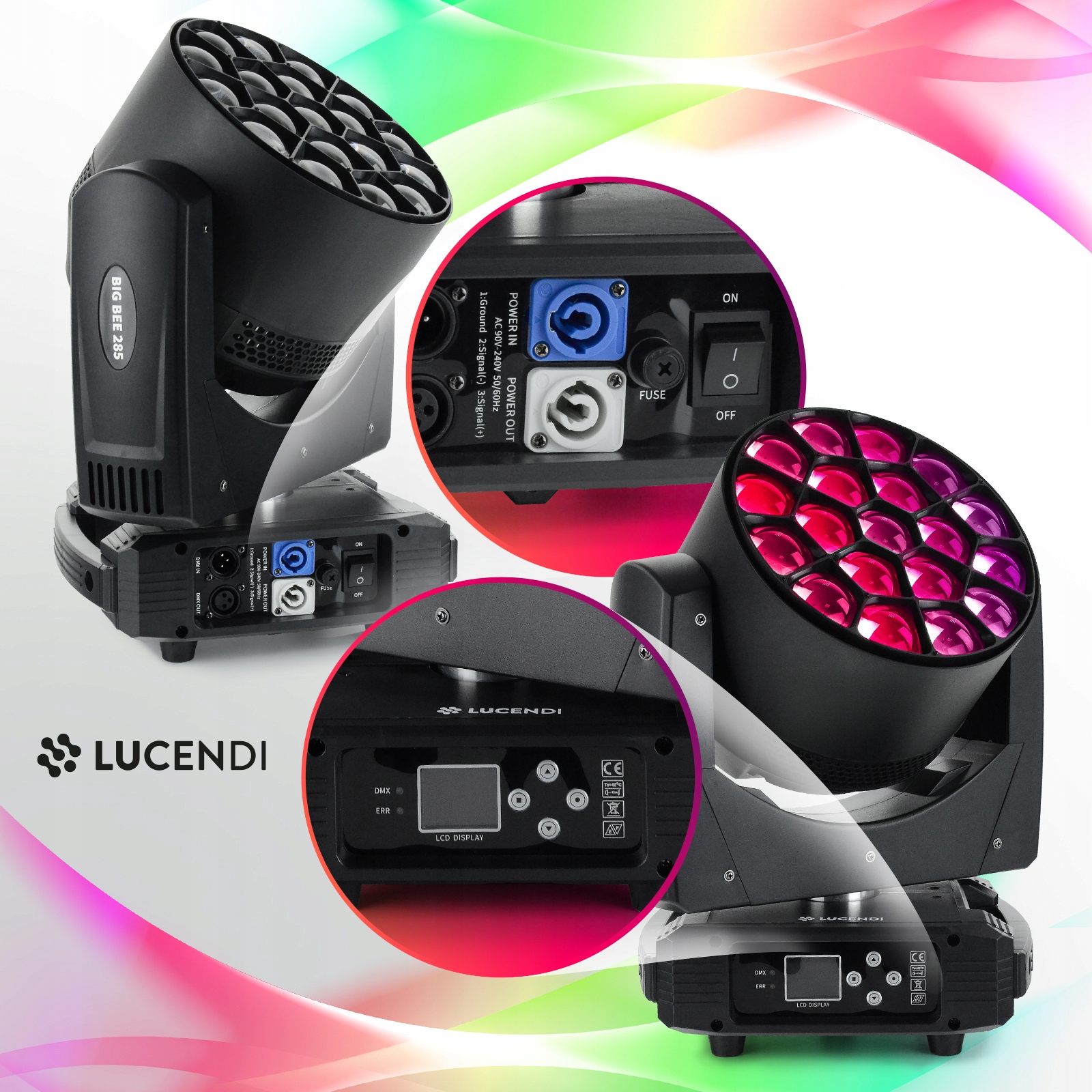 - dmx : расширенный управление с использованием внешних контроллеров DMX, обеспечивая полную персонализацию световых эффектов. Передняя часть устройства имеет цветный ЖК -дисплей и интуитивно понятную панель управления, состоящую из четырех кнопок, которые позволяют простой настройки конфигурации и быстрый доступ к меню.
