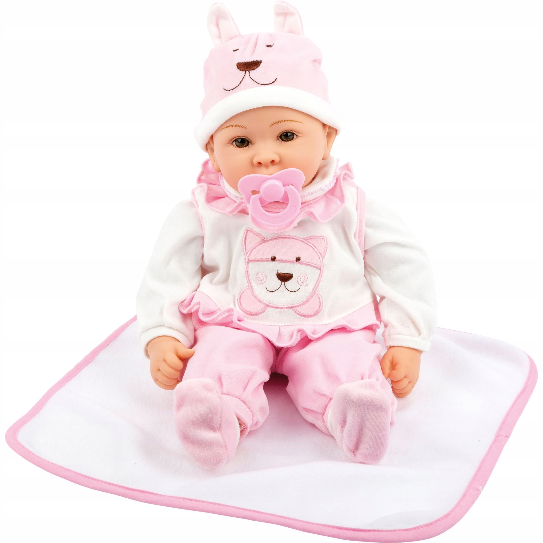На кукле розовый комбинезон, под ним белая блузка с воротником, носки и шапка со смешными бело-розовыми ушками. Все предметы одежды легко снимаются и надеваются. В комплект также входит бутылочка с молоком, пластиковая пустышка и белое одеяло с розовым рюшем.