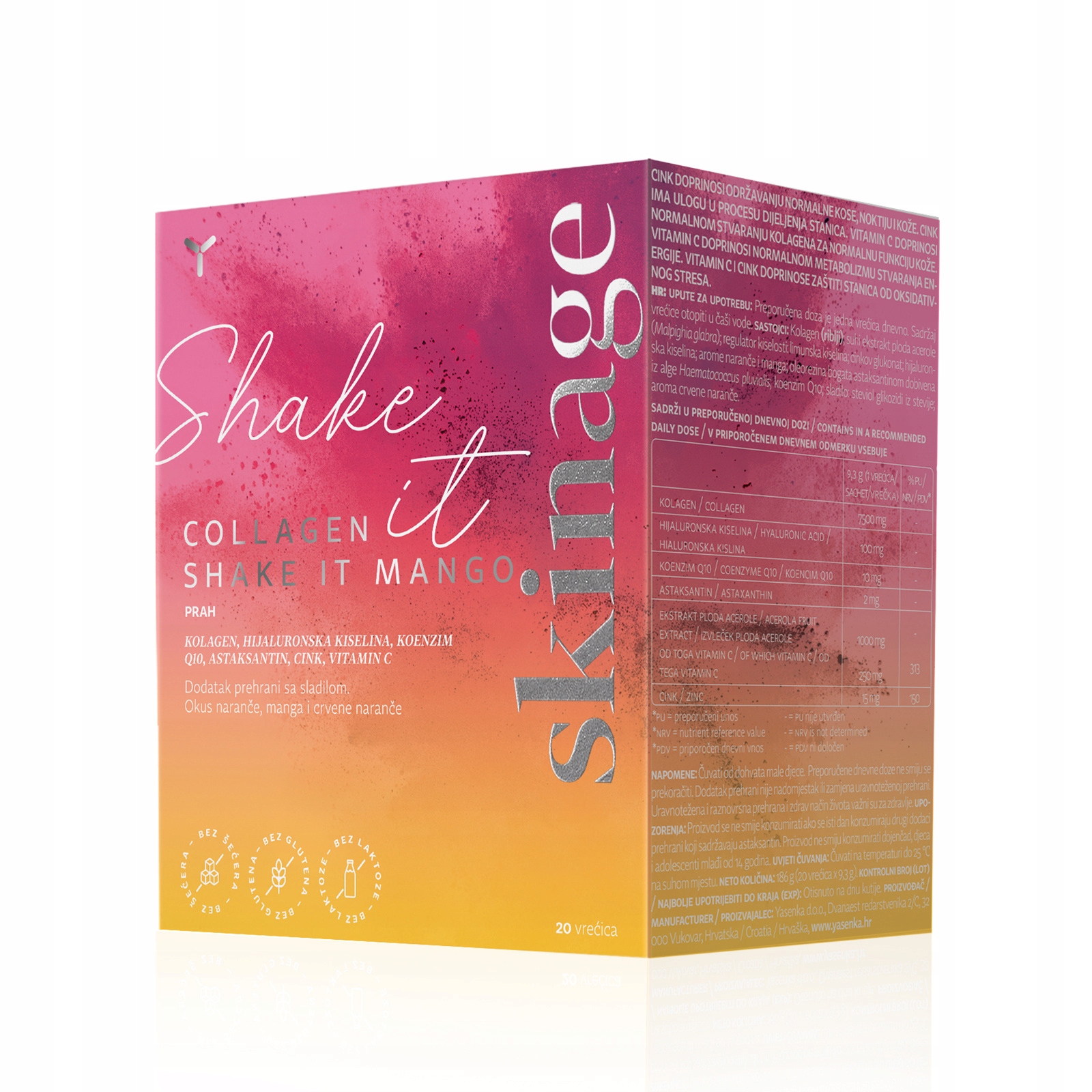 Skinage COLLAGEN SHAKE IT - инновационная пищевая добавка, сочетающая в себе до 7500 мг коллагена типа I, коэнзим Q10 MicroActive, гиалуроновую кислоту, астаксантин, ацеролу (натуральный витамин в) и глюконат цинка – в удобной, вкусной форме напитка с тропическим ароматом.