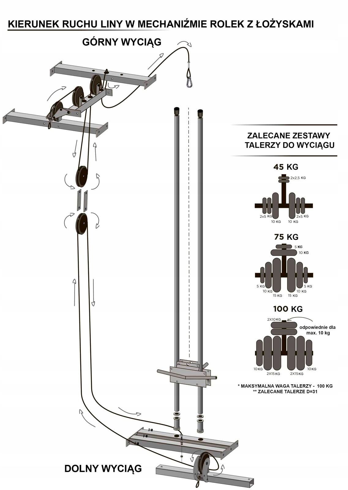- верхний и нижний шкивы смонтированы с помощью механизма из роликов с подшипниками на стальном тросе