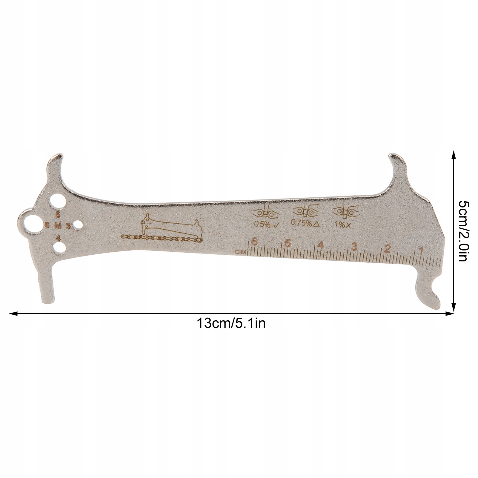 1. С 3 функциями: измерение повреждения цепи/измерение крюка цепи/болта, пескоструйная обработка, отсутствие блеска и заусенцев. 2,0,5%/0,75%/1% 3-этапное измерение, лучшее разделение условий измерения, известная степень износа цепи. 3. Конструкция цепного крючка, простота обслуживания цепи, высокая эффективность. 4. Линейка для измерения винтов, позволяет быстро измерить диаметр резьбы и длину винта, удобно и практично. 5. Изготовлен из нержавеющей стали, обладает высокой твердостью, износостойкостью, долговечностью, высокой точностью и точным отображением.