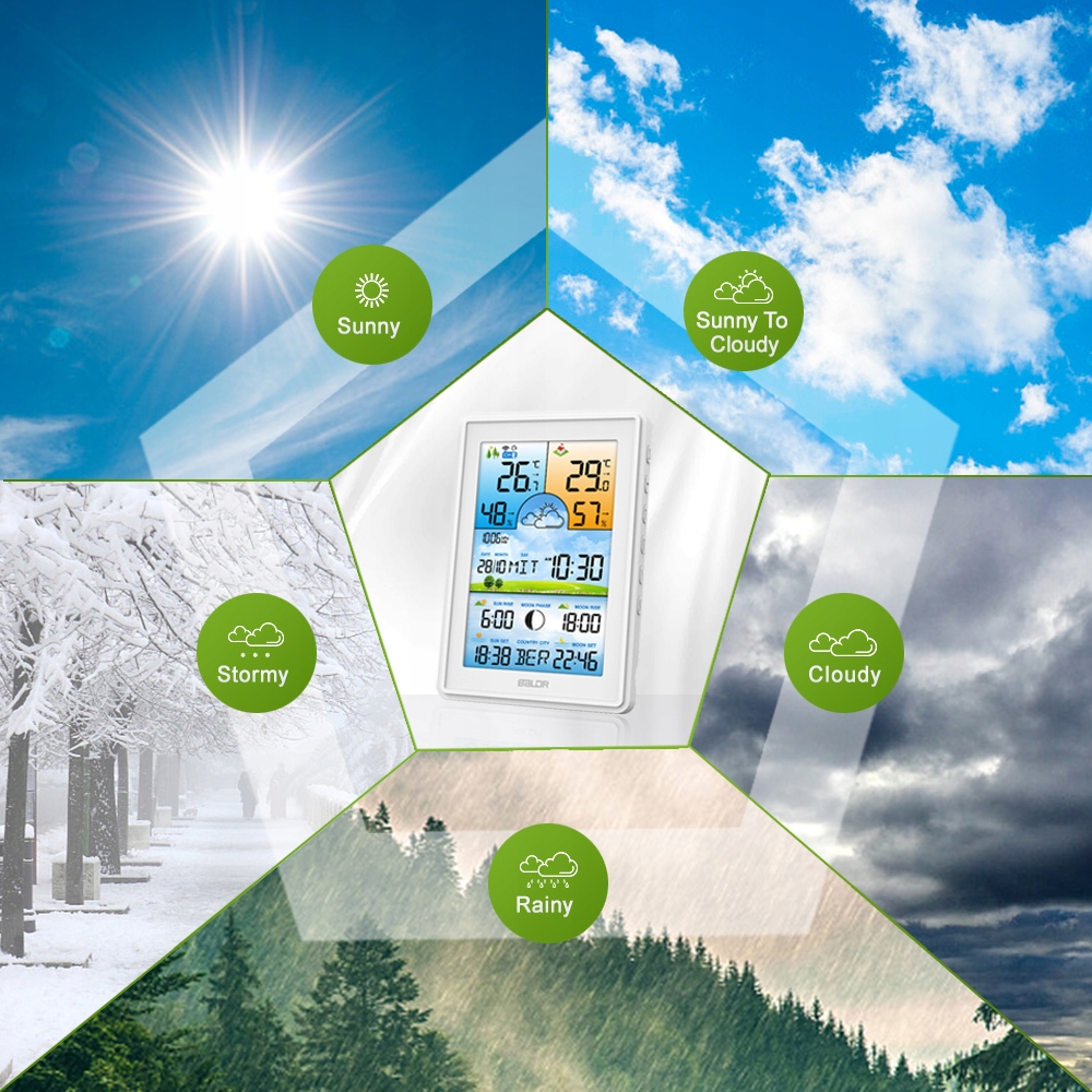 Многофункциональная беспроводная метеостанция Baldr B360-V2 с функцией оповещения о погоде: измеряет температуру в помещении и на улице, а также предсказывает местный прогноз погоды, что делает его идеальным выбором для получения точных измерений, доступных с одного взгляда на большой, легко читаемый дисплей.