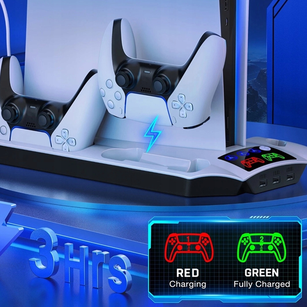 Быстрое зарядное устройство позволяет заряжать два контроллера PS5 Dualsense одновременно за 3 часа. Четкие светодиодные индикаторы показывают состояние зарядки. Красный: зарядка; зеленый: полностью заряжен. На экране имеется защитная пленка, предотвращающая появление царапин. Пожалуйста, снимите защитную пленку со светодиодного экрана. СОВЕТ: Охлаждающая база PS5 автоматически отключает питание при полной зарядке, чтобы защитить ваше оборудование.