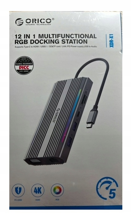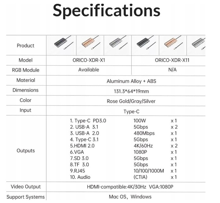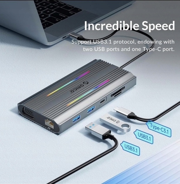 orico 12 в 1 (RGB) USB 3.1 Тип C Многофункциональная док-станция с USB-C 5 ГБ/с, 4K 60 Гц, PD 100 Вт, 5 Гбит/с USB-A 3.1. USB-A 2.0, 1080p VGA, 1000 МБ/с Ethernet, 3,5 мм аудиопорт, SD и TF-карты сокет (серое, розовое золото, серебро) | Xdr-x1