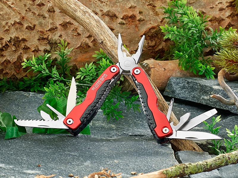 2 ножа, различные плоские и крестовые отвертки, плоскогубцы, пила и напильник — такая же часть этого универсального мини-ящика для инструментов, как открывалки для консервных банок и бутылок. Просто полный набор инструментов для любых целей. Независимо от того, выполняете ли вы мелкий ремонт по хозяйству, на компьютере или хотите починить свой велосипед – этот качественный многофункциональный инструмент значительно облегчит вам эту задачу и непременно станет вашим новым постоянным спутником. Этот карманный нож также будет очень полезен во время путешествий, кемпинга, походов и других видов активного отдыха.