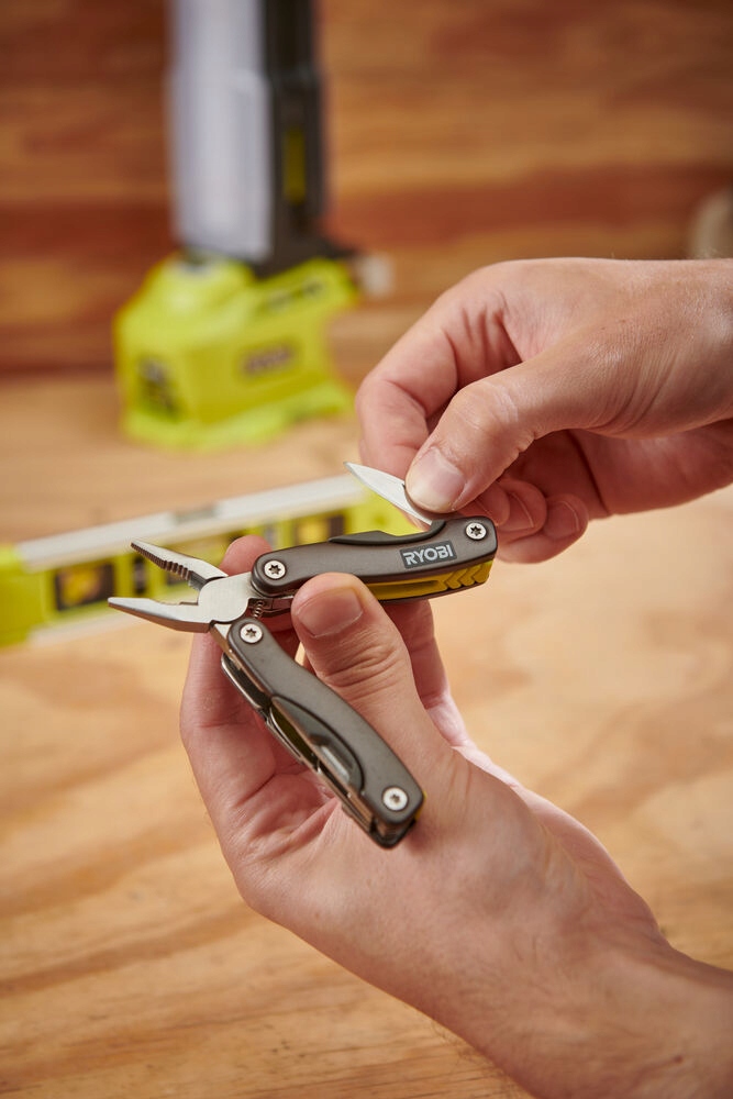 Мультиинструмент 14-в-1 Ryobi RMT14 5132005329 хорошо подходит для всех видов мелких работ и ремонта. Он изготовлен из нержавеющей стали с ручкой из алюминия и ABS. Инструмент небольшой и практичный, поэтому поместится в кармане.