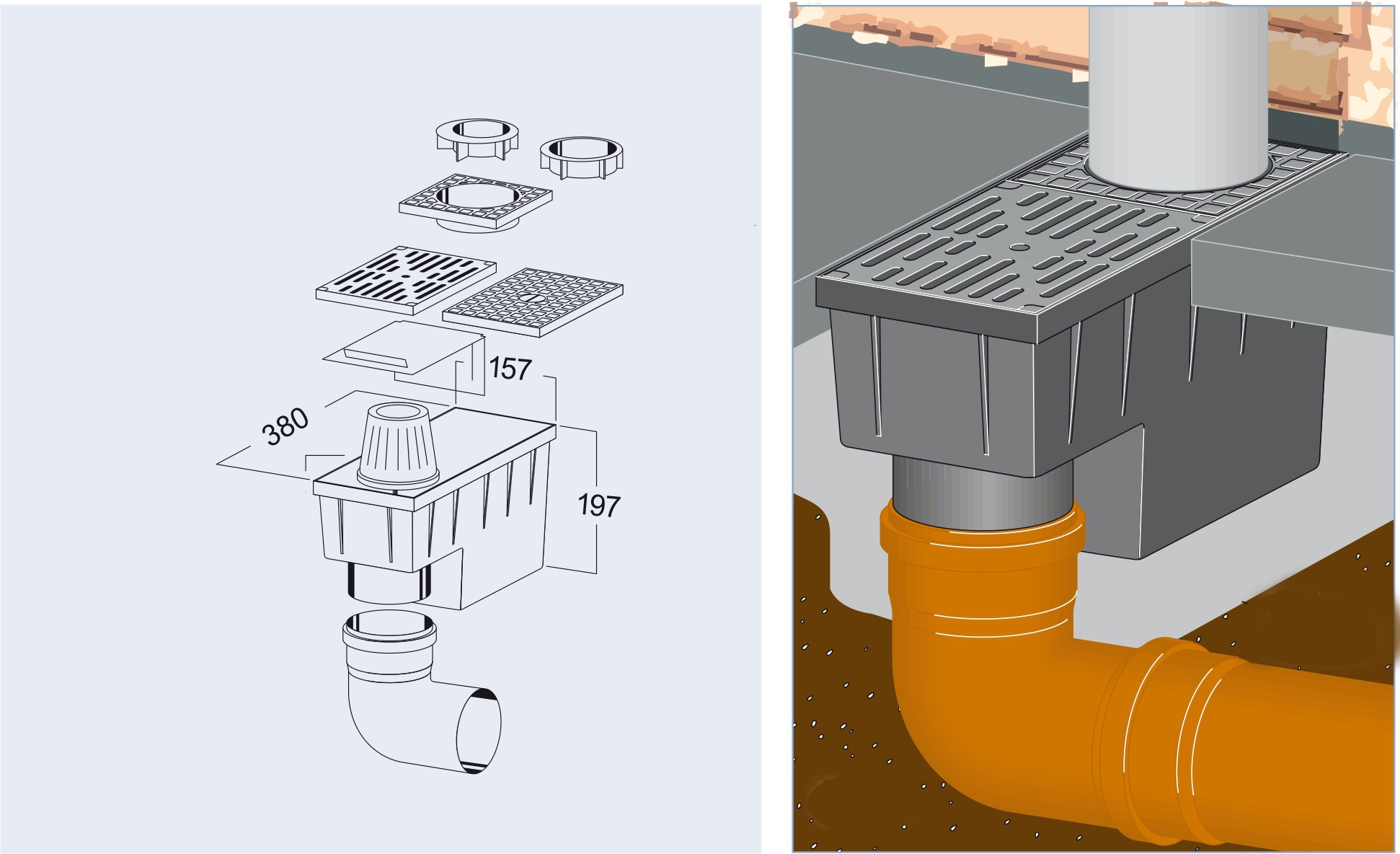 Поселенцы выполняют функцию, которая защищает от загрязнения и блокировки трубы, истощающей дождевую воду для канализационной системы или скважины. Он может выступать в качестве только поселенца, затем мы закрываем тело (отмечено № 1 на фотографии), обложку (№ 2) или действует в качестве решетки поселенцев и сточных вод, затем мы покрываем тело решением для решетки (№ 3 ). Фотография) Ускоряет более тяжелые отложения к нижней части тела; Большинство типичных диаметров сливных труб, как ПВХ, так и стали: 105-110 мм, 87, 5-90 мм, 75 мм . с коленом сточных вод с уплотнением Ø 110 мм . Черный цвет поселенца соответствует практически любому цвету дренажной трубы
