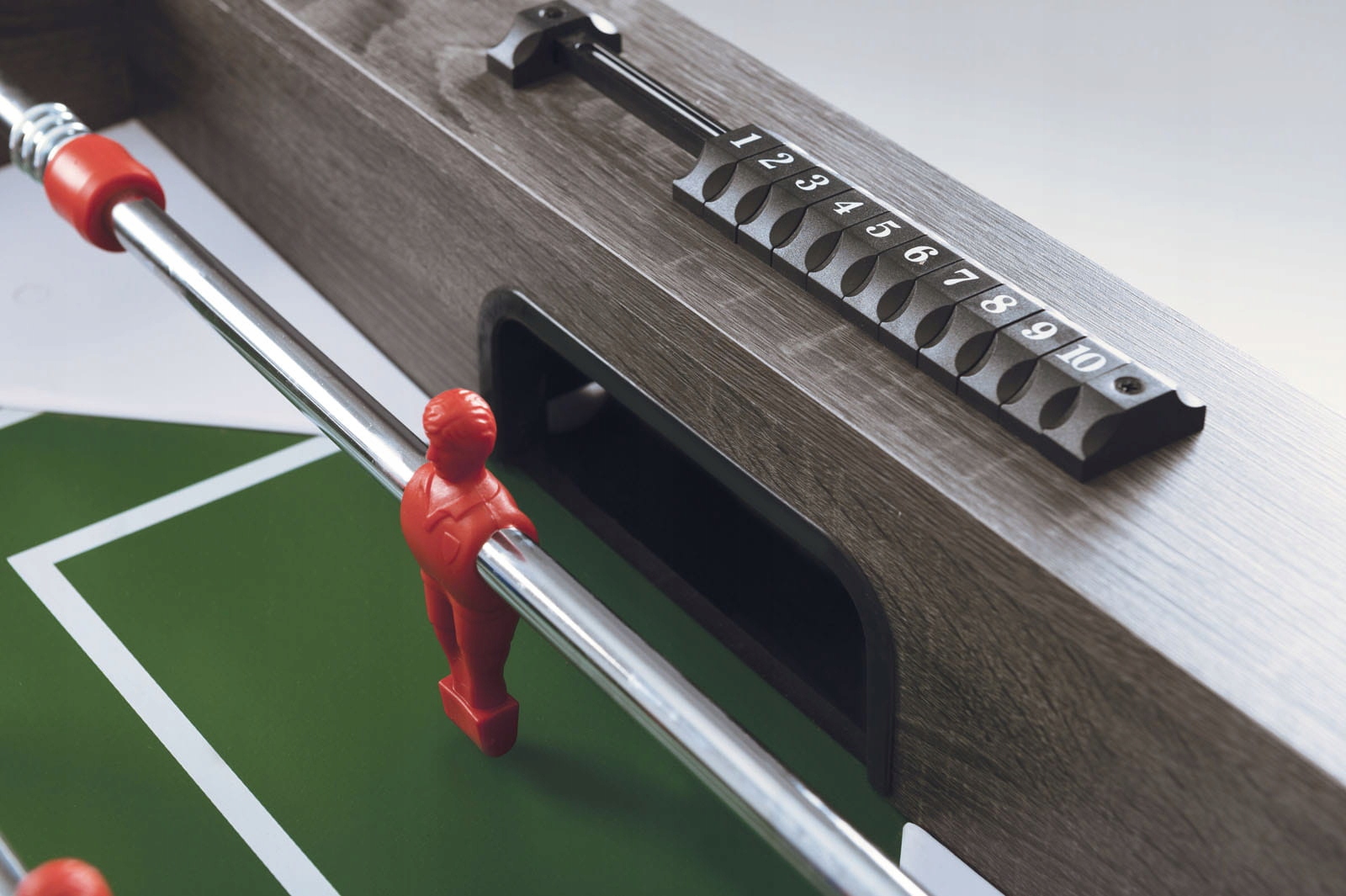 Football Features All-in-9: Football Playground: MDF PITE, покрытый зеленым меламин с белыми линиями, изготовленными с использованием метода трафаретной печати, имитирующей шаг стадиона. Диаметр 16-миллиметровых стержней из высокопрочной стали с антикоррозионным покрытием. Выдвижные грили. Стальные шариковые подшипники, обеспечивающие высокую плавность: заметная скорость игры, меньше нагрузки на запястья игрока. Красные и синие фигурки футболистов из неразрушимого пластика, питаемых грилям, с использованием прямого образования. Поместить цели проще и приятнее благодаря вратаря, который оборачивается. Два иллюминатора, расположенные за воротами. В наборе 3 белых «стандартных» шариков.