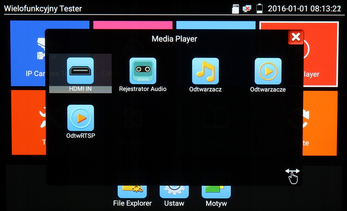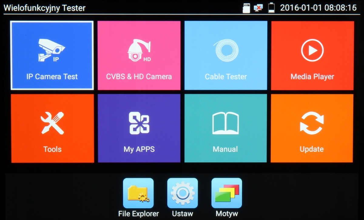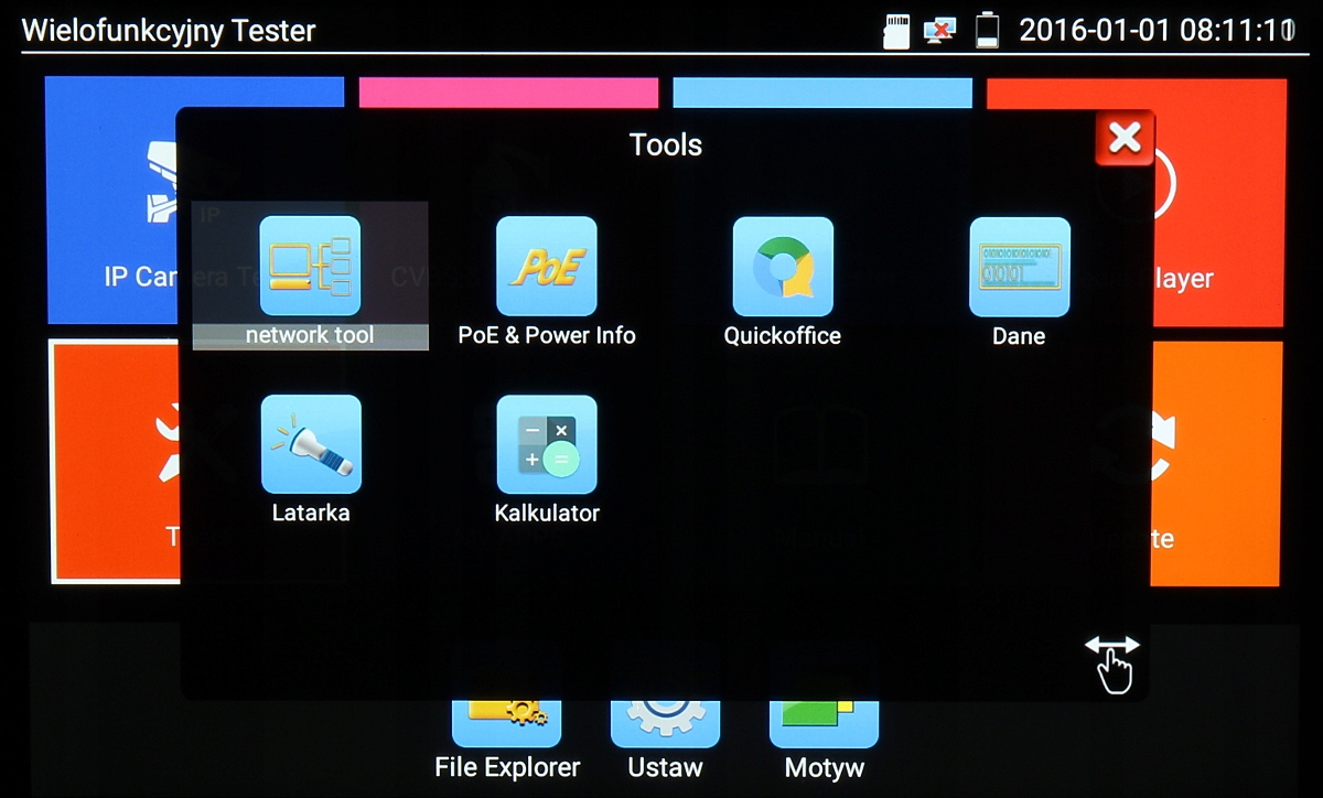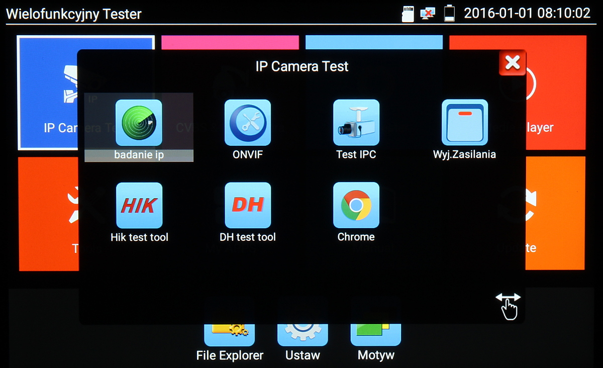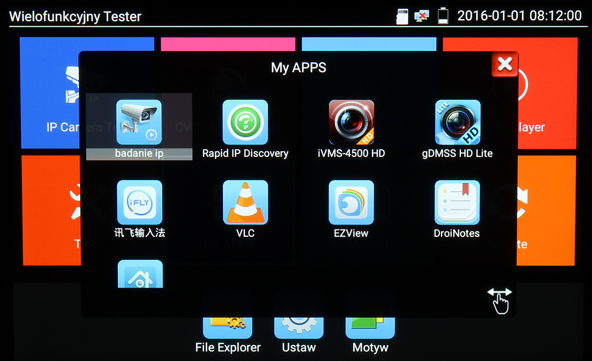 - Выбранные функции: Тест камеры AHD, Тест HD-CVI камеры, тест камеры HD-TVI, тест камеры PAL/NTSC, тест IP-камеры - Поддерживаемые методы сжатия изображения: H.265, H.264, MJPEG, Поиск и предварительный просмотр Onvif-совместимых IP-камер, Управление поворотными устройствами и PTZ-камерами ( скоростная купольная камера), просмотр с IP-камер с помощью встроенных приложений — iVMS-4500 HD, EZView, gDMSS HD Lite, XMEye, MEye, Fseye, встроенный веб-браузер — Google Chrome, генератор управляющих сигналов, мониторинг LAN-соединения, IP-адрес сканер, PING - тестирование канала с помощью ICMP-пакетов, Обнаружение подключенного порта в коммутаторе, Тестер витой пары, Взаимодействие с камерами и коммутаторами PoE, Измеритель мощности PoE, Источник питания постоянного тока 5В/12В/24В/48В, Монитор данных - Монитор последовательного порта RS-485, Аудиотест, Точка доступа — Wi-Fi, Запись видео на карту micro SD с возможностью воспроизведения — 8 ГБ в комплекте, Воспроизведение записи, Калькулятор, Встроенный фонарик