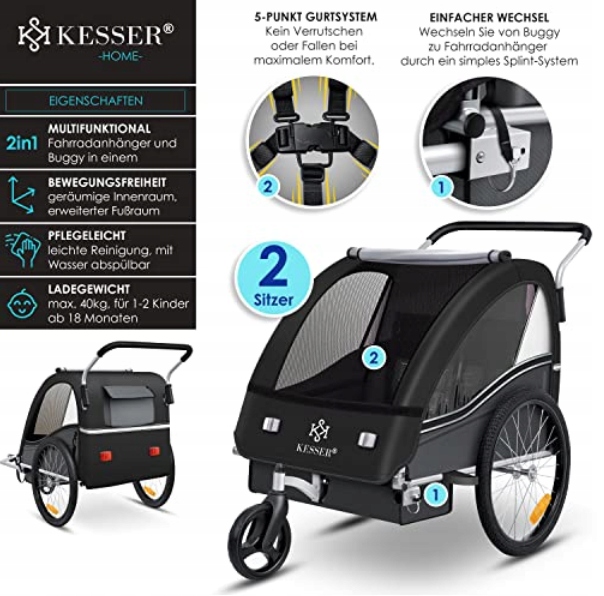 безопаснее, более быстрое и лучшее путешествие с Кессером! Идеально подходит для прогулок, велосипедных поездок, посещений бабушек и дедушек или пикников в парке. Возможность быстро превратить его из коляски в велосипедный трейлер позволяет гибко адаптироваться к потребностям пользователя. Он также идеально подходит для покупок или транспортировки мелких предметов. Всего несколько шагов, чтобы превратить его в тележку бега! Дополнительное место для хранения позволяет взять игрушки, закуски и другие необходимые аксессуары
