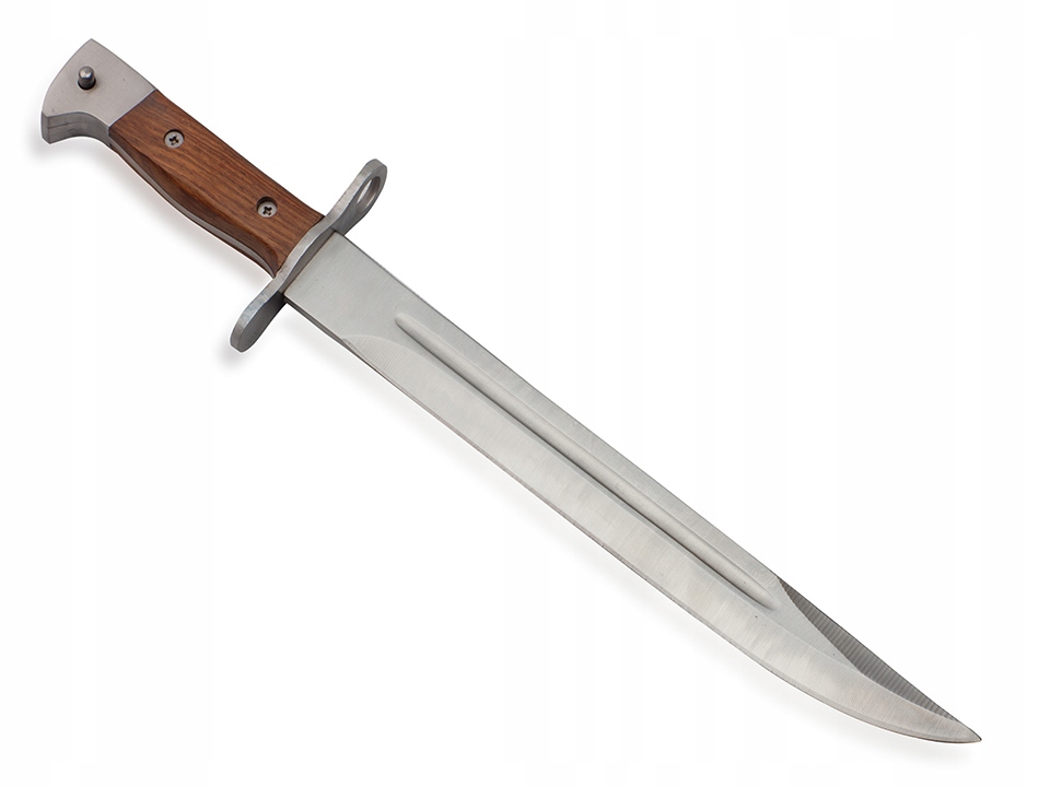 Широкая стальная накладка, в Помимо классической функции защиты руки от соскальзывания к клинку, он имеет кольцо для надевания на ствол винтовки.