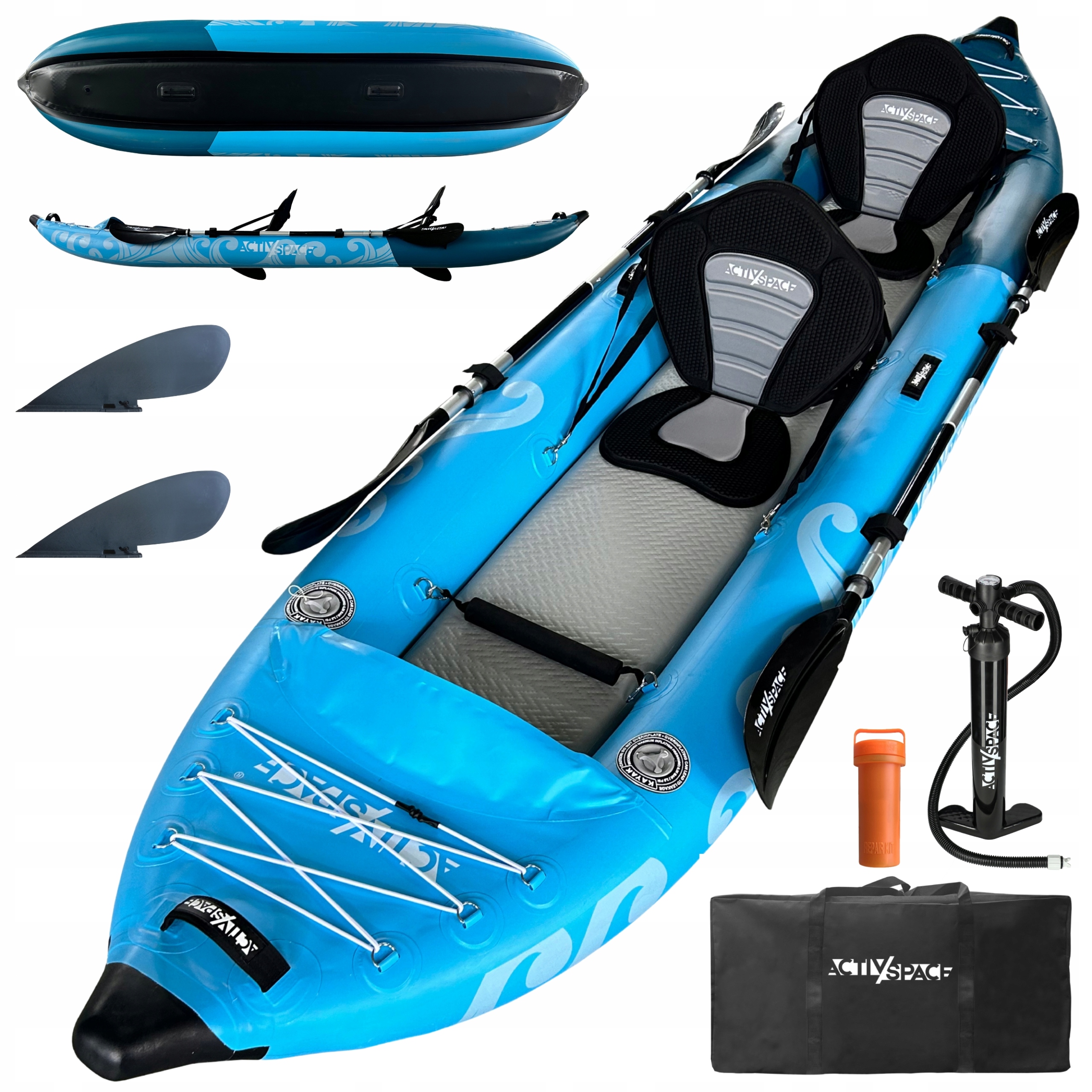 Надувной двухместный каяк Activ/Space весит 18 килограммов, а его размеры обеспечивают комфорт и безопасность двух пассажиров. Длина каяка составляет 385 сантиметров. Кроме того, 2 воздушные камеры + 2 плавника обеспечивают стабильный курс.