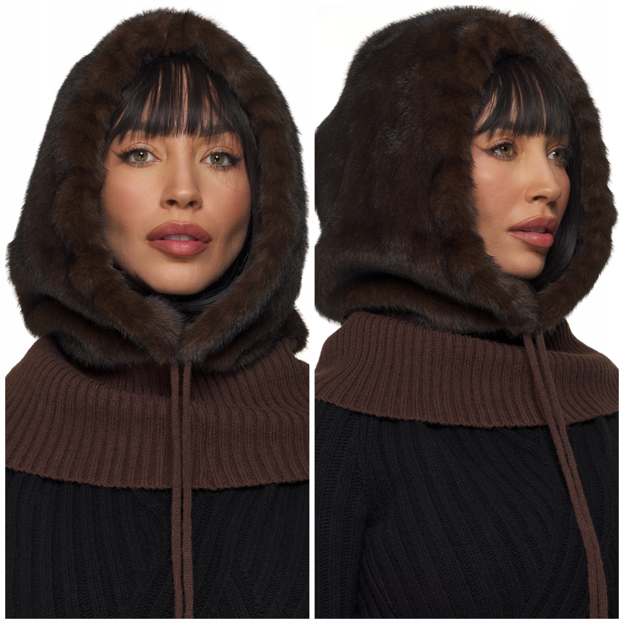 БАЛАКЛАВА С КАПЮШОНОМ, БАЛАКЛАВА ЖЕНСКАЯ, вязаный мех, шоколадно-коричневый