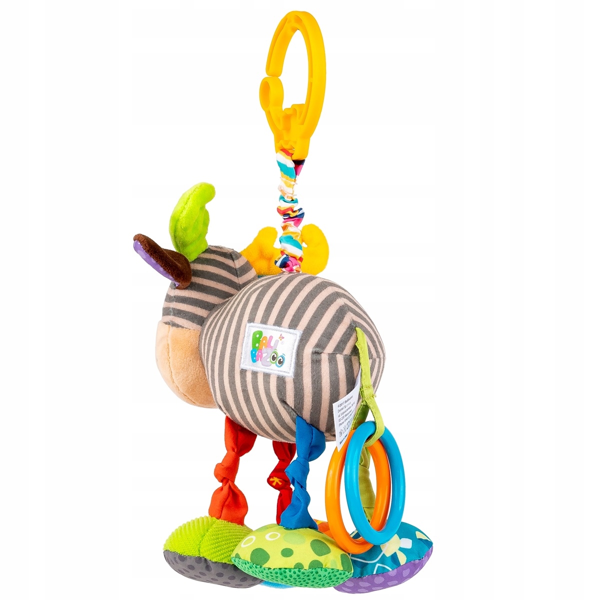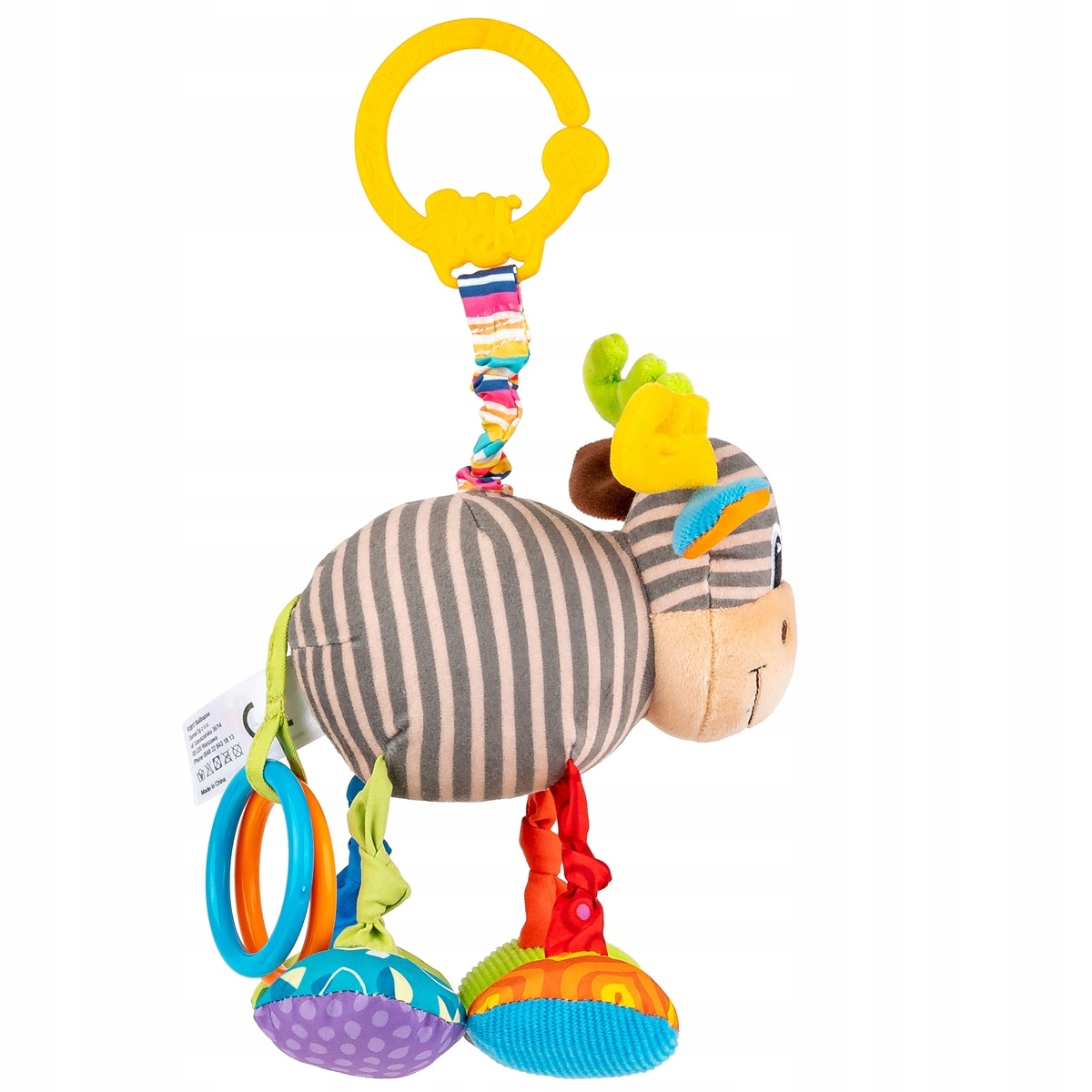 Алек — лось для особых задач. Он развлекает малыша, весело «машя» ножками, оказывает тактильную стимуляцию, развивая тем самым познавательные способности ребенка, и даже вибрирует! Животное выполнено из материалов, различающихся по цвету, рисунку и фактуре, а возле его хвоста расположены два разноцветных круга. Чтобы запустить вибрацию, просто потяните лося вниз, и он снова поднимется на тканевый аккордеон, забавно вибрируя при этом. Животное оснащено практичным кулоном, благодаря которому его можно легко прикрепить к выбранному месту.