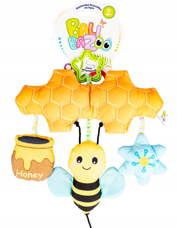 Веселый кулон занимательен и таит в себе много сюрпризов! Улыбающаяся пчела весело покачивается и попискивает на сотах, снабженных закрытым колокольчиком. Ее сопровождает шуршащая бочка с медом и скрипящий цветок. Игрушка имеет практичную подвеску в виде звезды, которую можно прикрепить куда угодно.