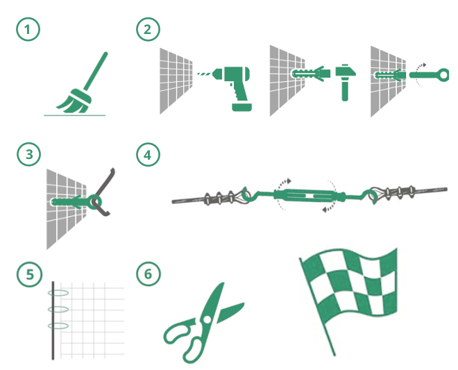 2. Инструкции по техническим вопросам монтажа сетки (включая подготовку поверхности, расстановку монтажных принадлежностей). На нашем YouTube-канале вы найдете видеоинструкцию по установке сетки, подготовленную специально для вас: https://youtu.be/Fq6uq7syPwM (сборка на стальном тросе)