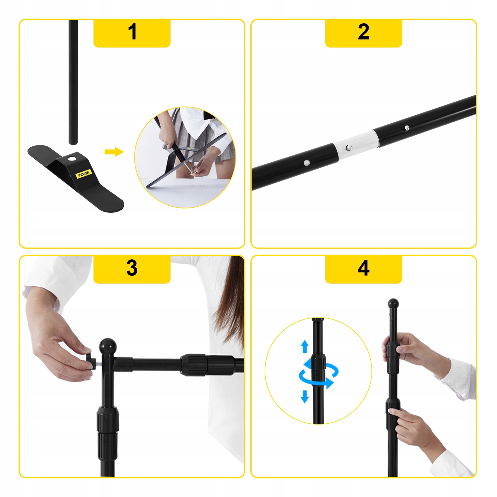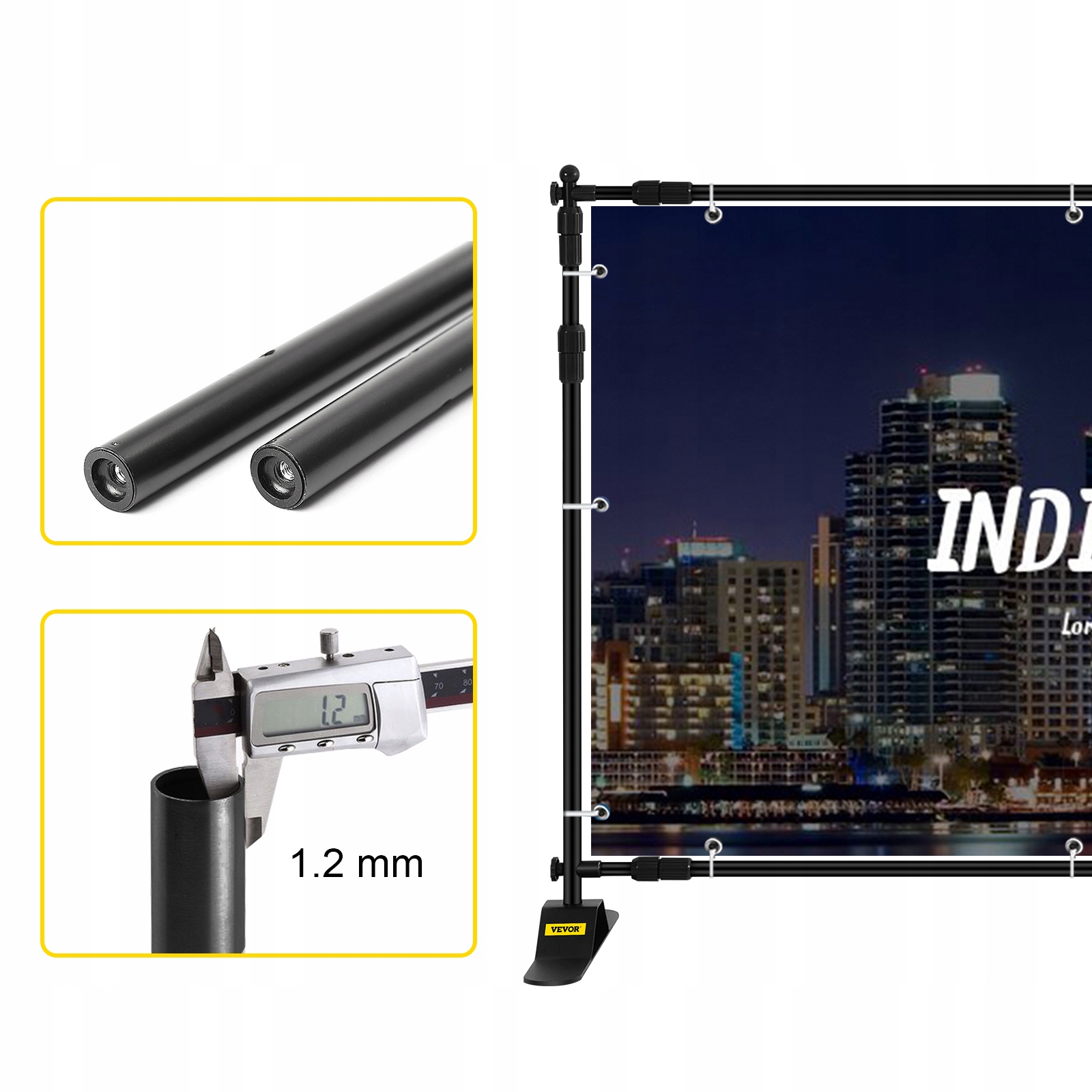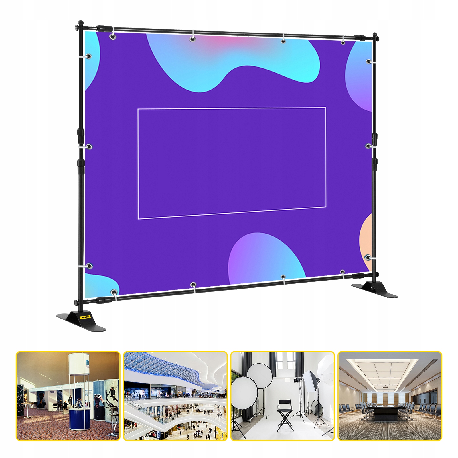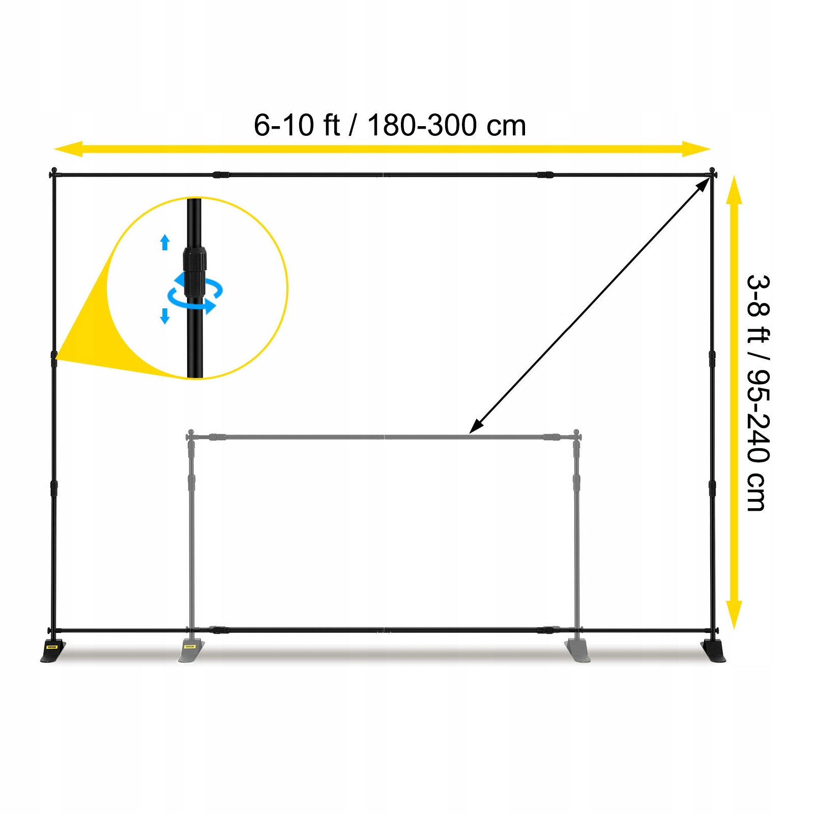 Эта фоновая рама имеет регулируемую ширину и высоту, прикручивая полюсы к месту. Поддерживает любой размер баннера от 6 x 3 фута / 180 x 95 см до 10 х 8 футов / 300 x 240 см.