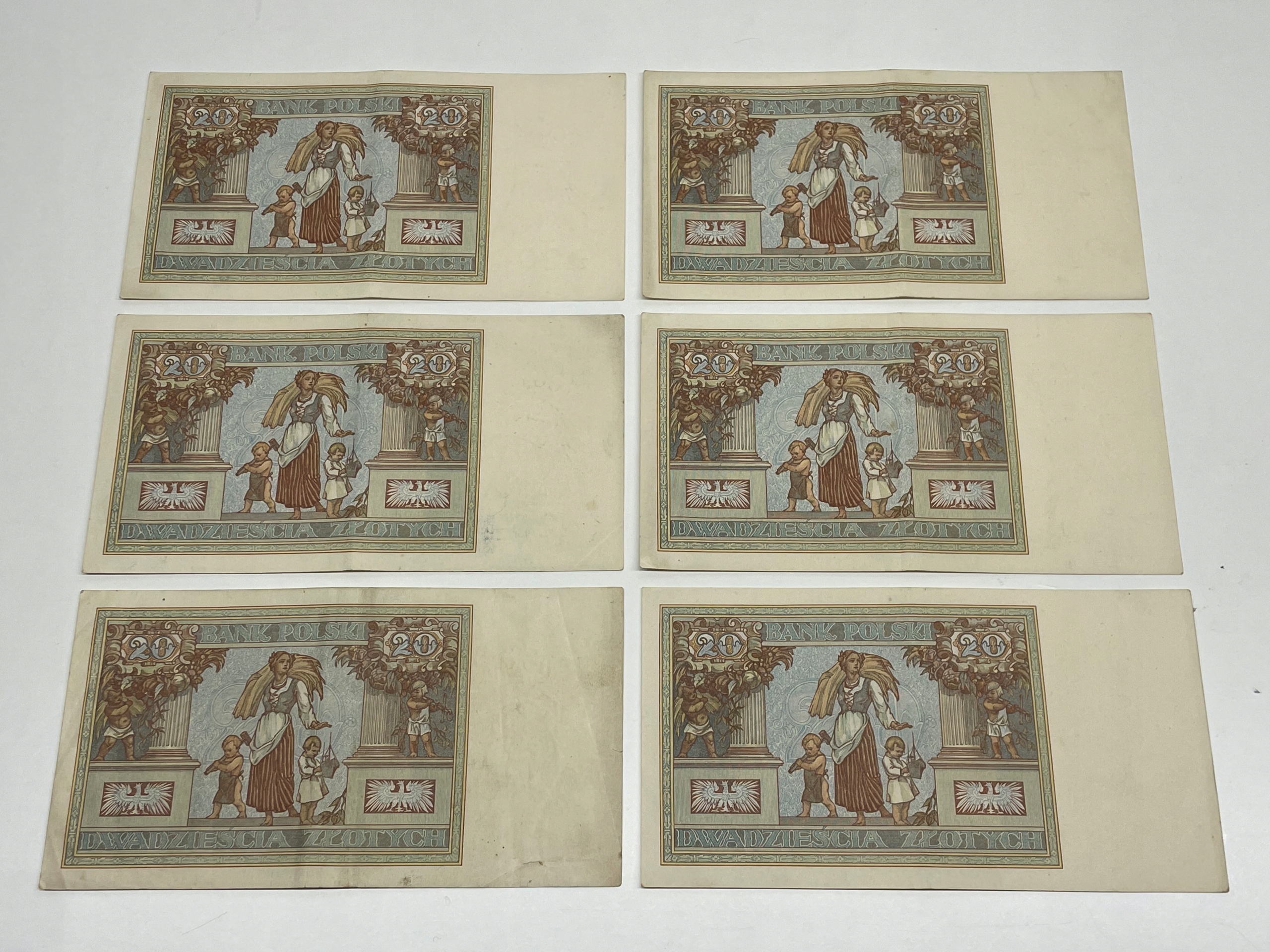 БАНКНОТЫ - 6 x ДВАДЦАТЬ PLN - 6 x 20 PLN - ВАРШАВА 20 ИЮНЯ 1931 г. - BANK POLSKI - СЕРИЯ DH - 6 ПОСЛЕДОВАТЕЛЬНЫХ НОМЕРОВ