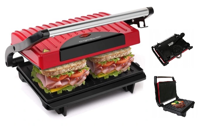 - Гриль, сэндвичница. Мощность 700 Вт, холодная ручка, антипригарное покрытие. Не содержит BPA, красный и черный цвет.
