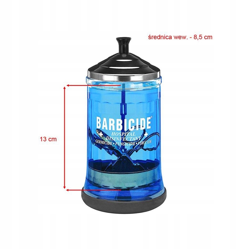 Характерный контейнер BARBICIDE с прозрачным синим дезинфицирующим средством. жидкость – это символ профессионального салона и на высоком уровне. Контейнер с Барбицидом известен в салонах красоты и парикмахерских по всему миру.