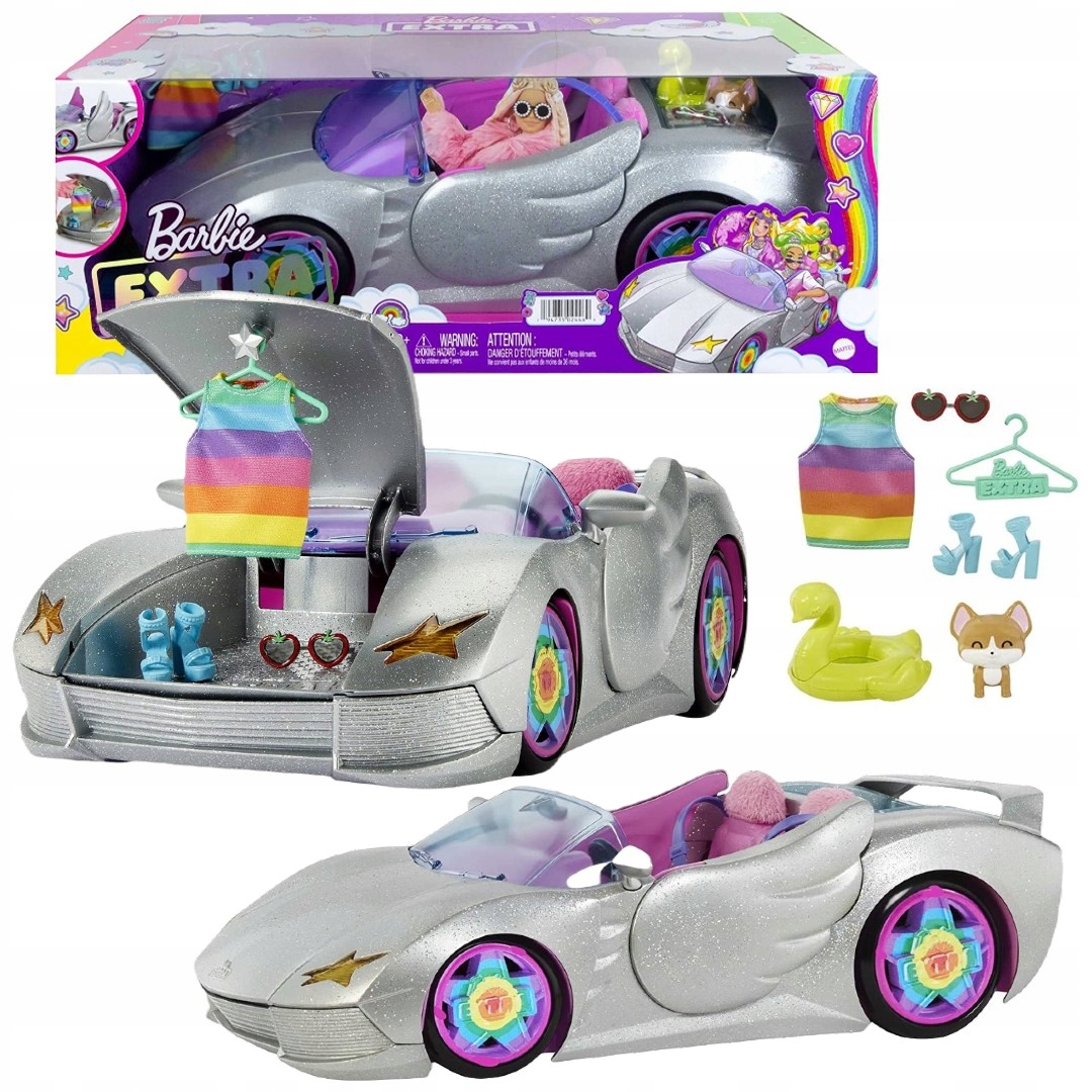 Пришло время ДОПОЛНИТЕЛЬНОЙ поездки! Этот автомобиль Barbie Extra — настоящий кабриолет знаменитостей! Отправляйтесь в путь в стиле ЭКСТРА на этом спортивном двухместном кабриолете с блестящим серебристым кузовом, характерной розовой обивкой и уникальными деталями, такими как радужные диски, двери в форме крыльев и меховые подголовники. УХ ТЫ! Когда придет время сменить одежду, откройте багажник — там поместится пара обуви и модная футболка (предметы входят в комплект)!