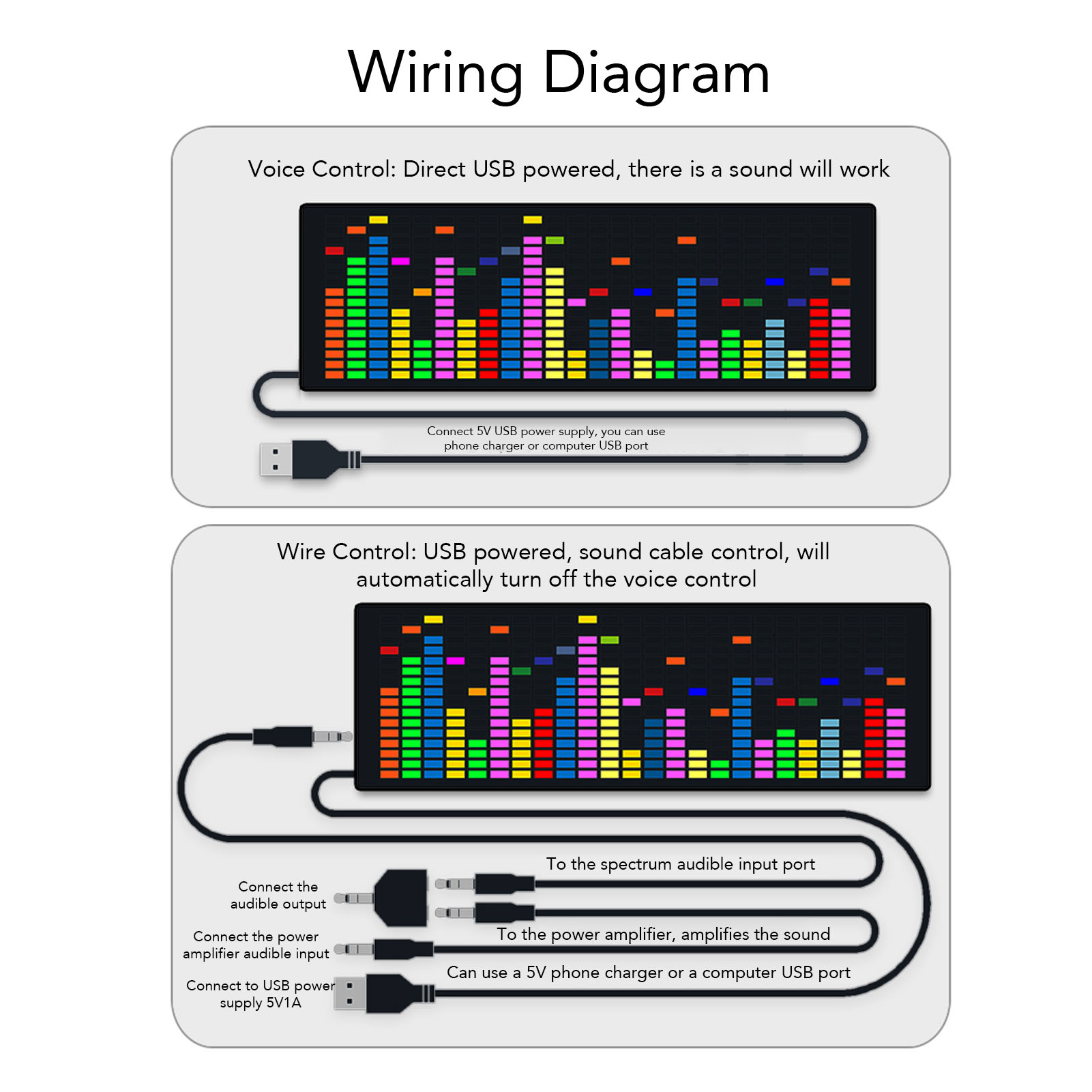 3. РЕЖИМЫ ПОДКЛЮЧЕНИЯ: Светодиодный дисплей музыкального спектра, встроенный голосовой датчик, нужен только источник питания, для работы не нужно подключать звуковой кабель; Управление звуковой линией, подключение питания и звуковой линии для работы, а также подключение звуковой линии для автоматического отключения функции голосового датчика, что позволяет избежать влияния шума на эффект отображения. Вы можете выбрать способ подключения в соответствии с окружающей средой