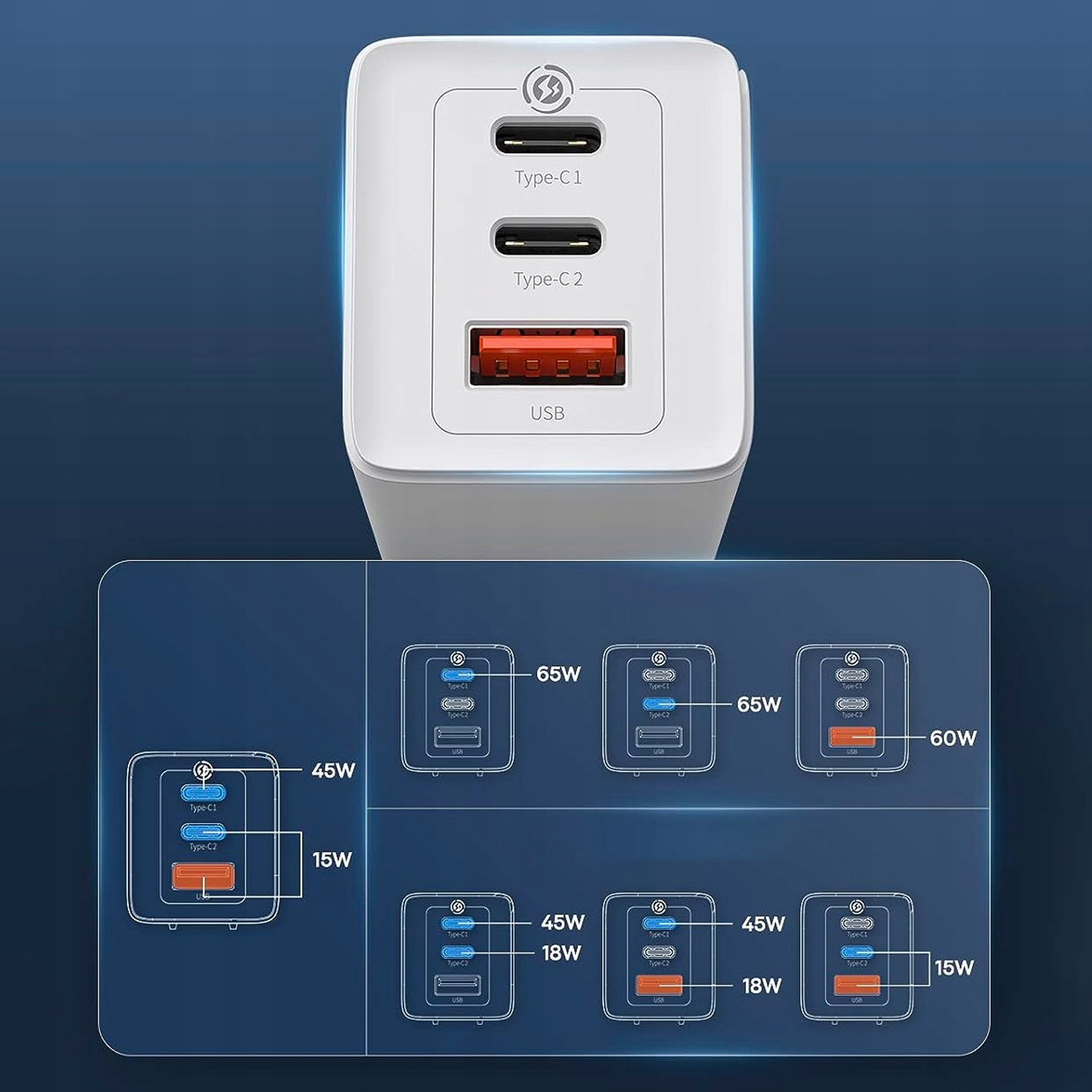 - USB-C1 + (USB-C2 + USB-A) : 45 Вт + 15 Вт.
