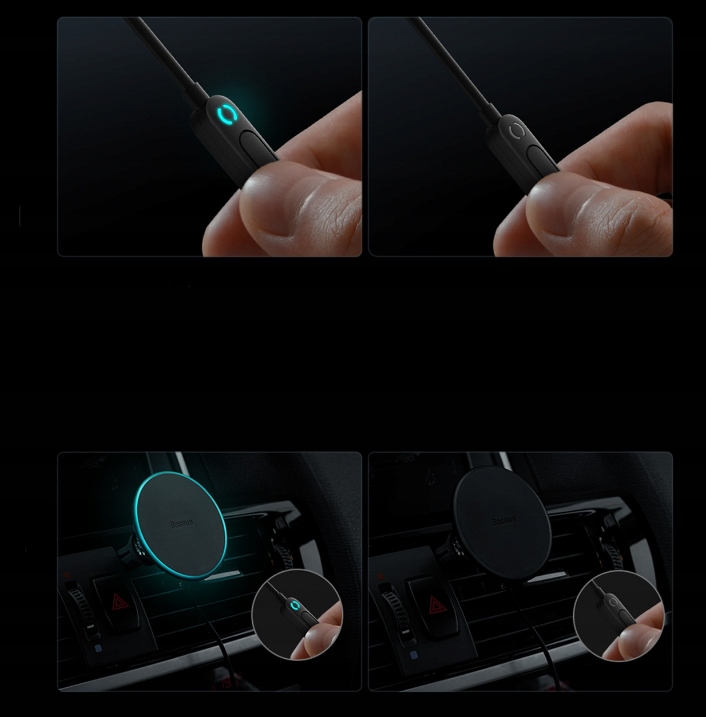 Зарядное устройство питается от прикуривателя, а магнитный держатель легко крепится на вентиляционную решетку. Встроенный пульт дистанционного управления позволяет вручную включать и выключать питание. Более того, магнитное кольцо излучает атмосферный синий свет, поэтому вы сможете легко найти его в темноте и быстро подключить телефон.