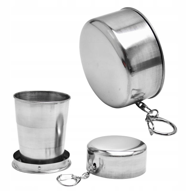 - Очень большой, складной, туристический, дорожный стакан из цельного металла. Держатель для подвешивания, например, на шнурке или на ключах. Удобный и практичный. Он поместится в кармане и всегда будет с вами.