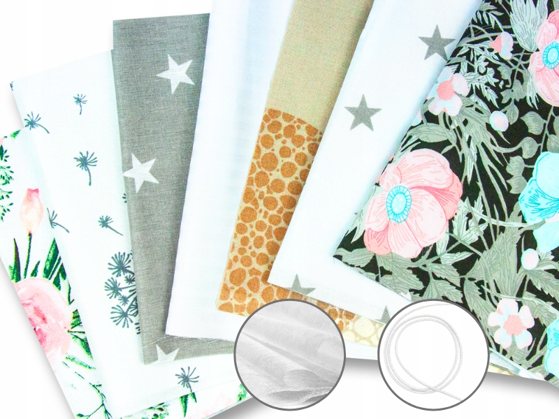 - Комплект из 14 кусочков хлопка 40х20 см + резинка 5м + 14 кусочков флизелина 20х20.