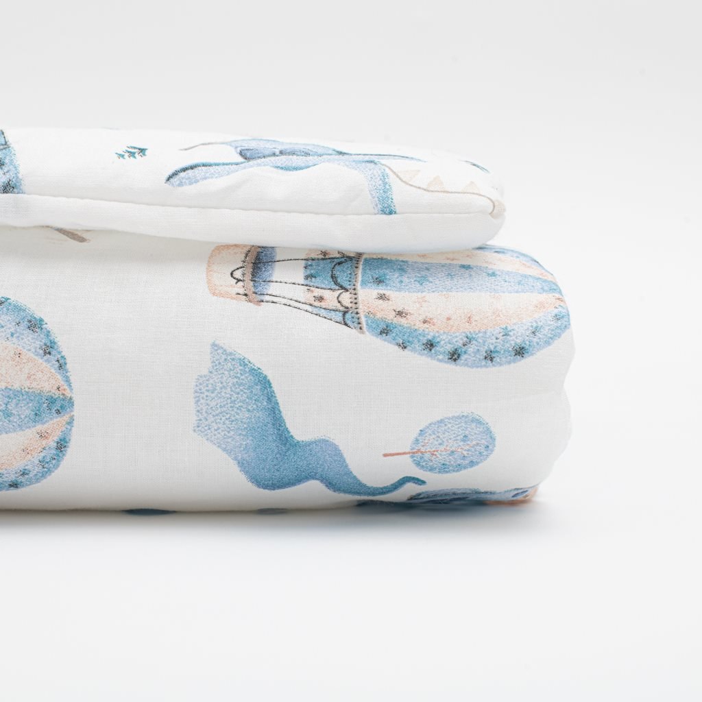 Красивый хлопок для новой романтической коляски. Набор включает в себя подушку и стеганое одеяло с печатью сказочного приключения в облаках. Целое заполнено антиаллергическим волокном. Набор изготовлен из высококачественного хлопка. Комплект хлопка будет роскошным, нежно ласкает и нагревает кожу ребенка. Размеры: подушка: ок. 32x25 см, стеганое одеяло: ок. 82x68 см. Композиция: 100% хлопчатобумажного покрытия, 100% наполнение полиэстера.