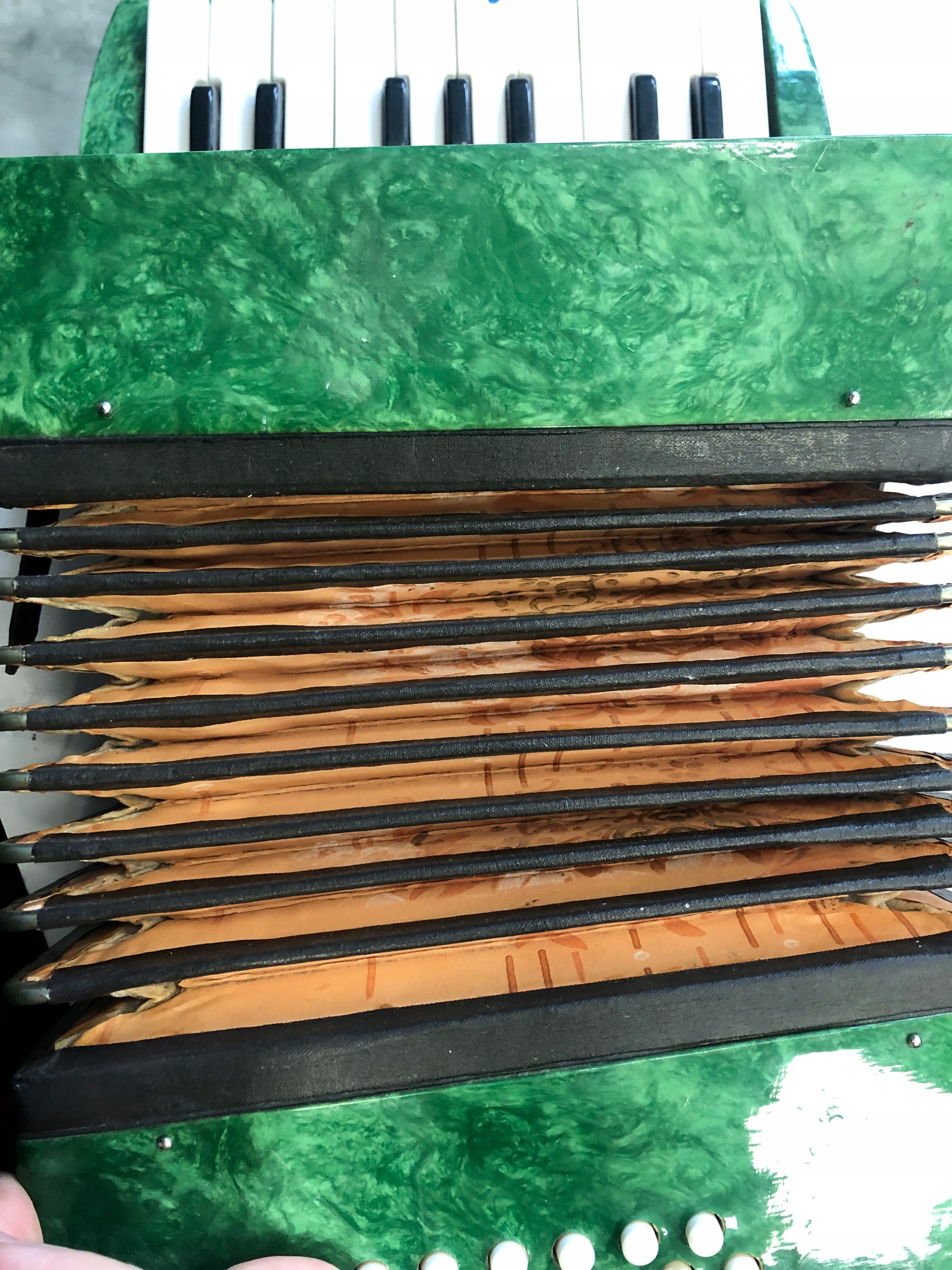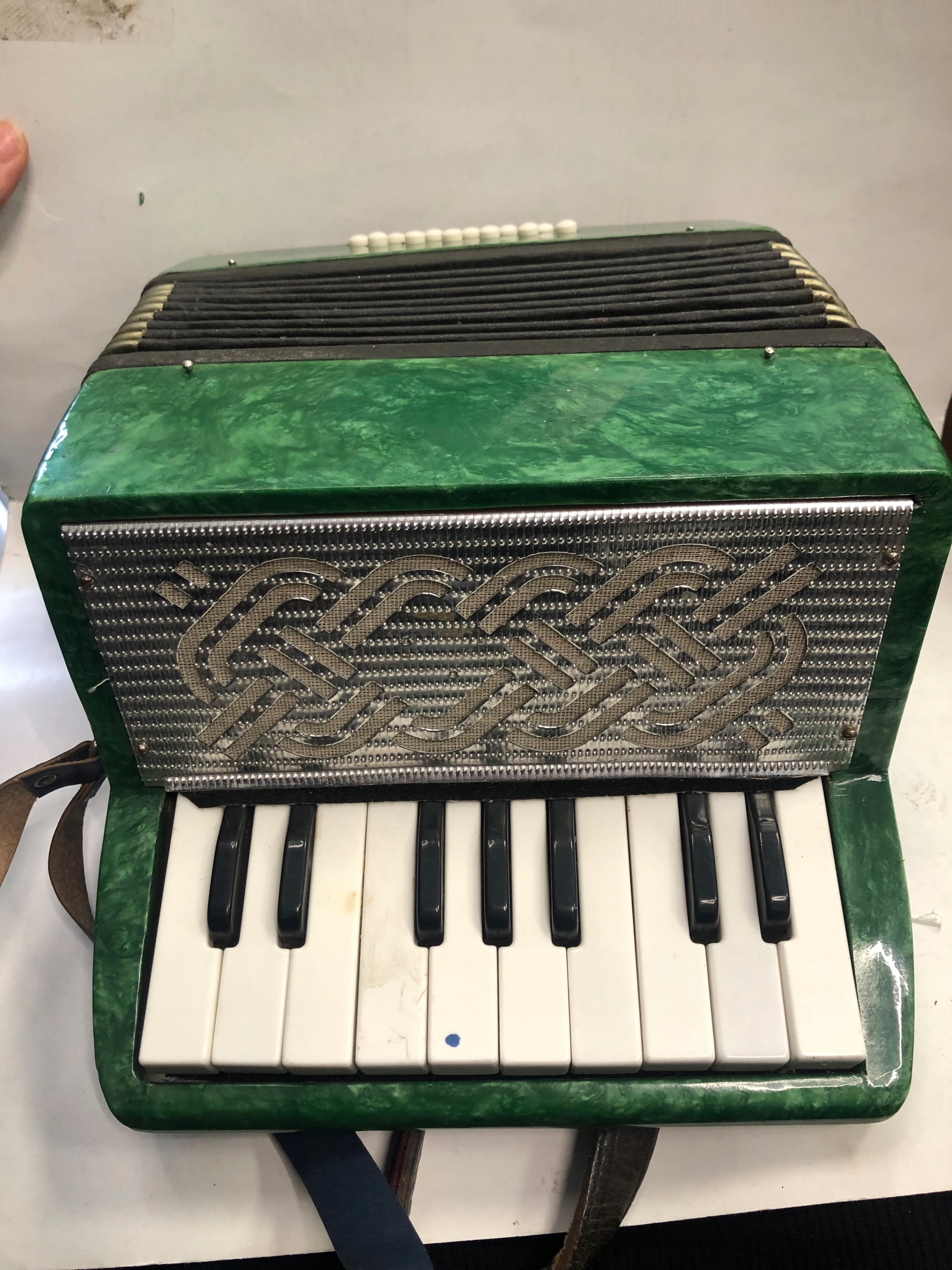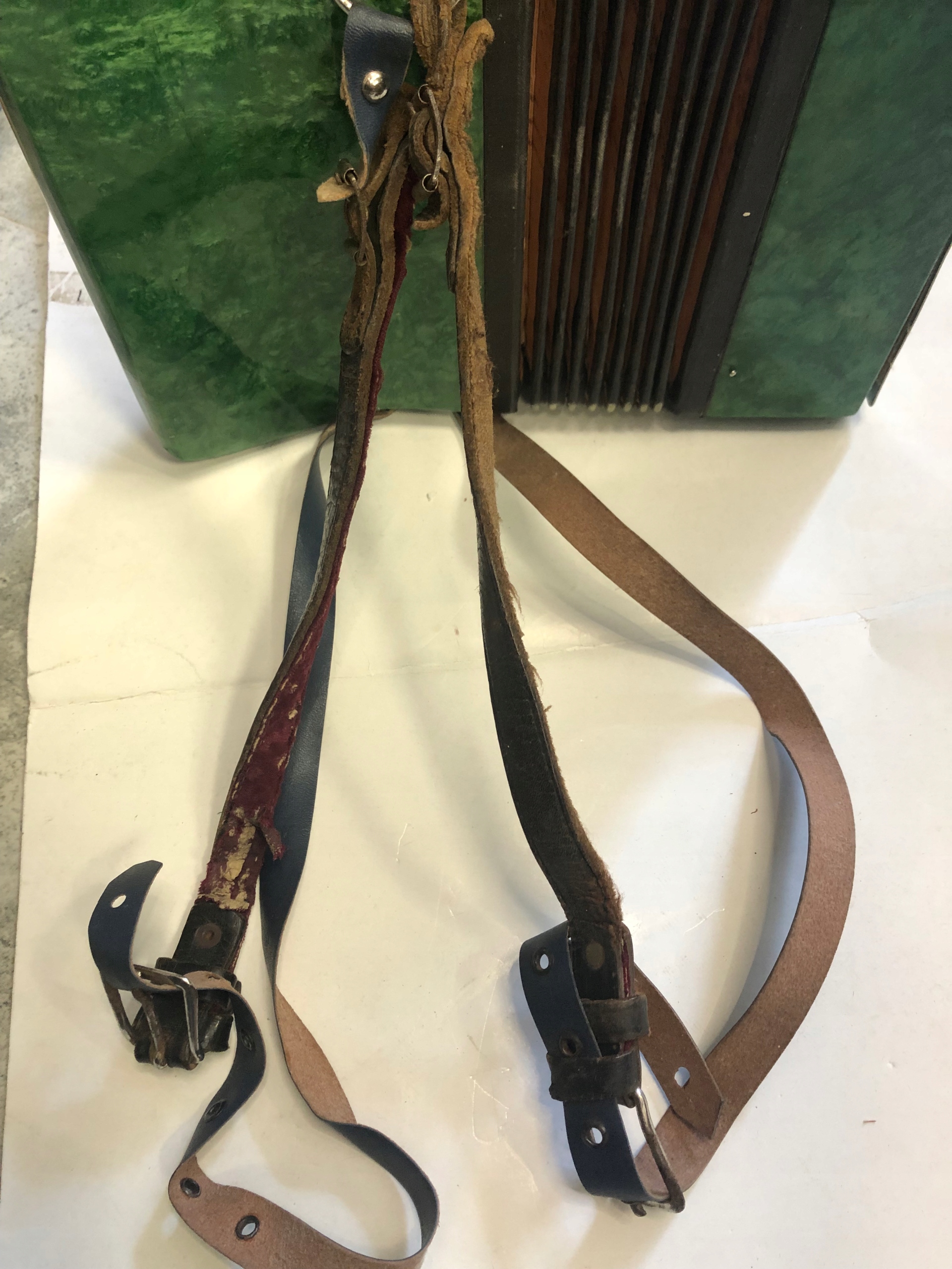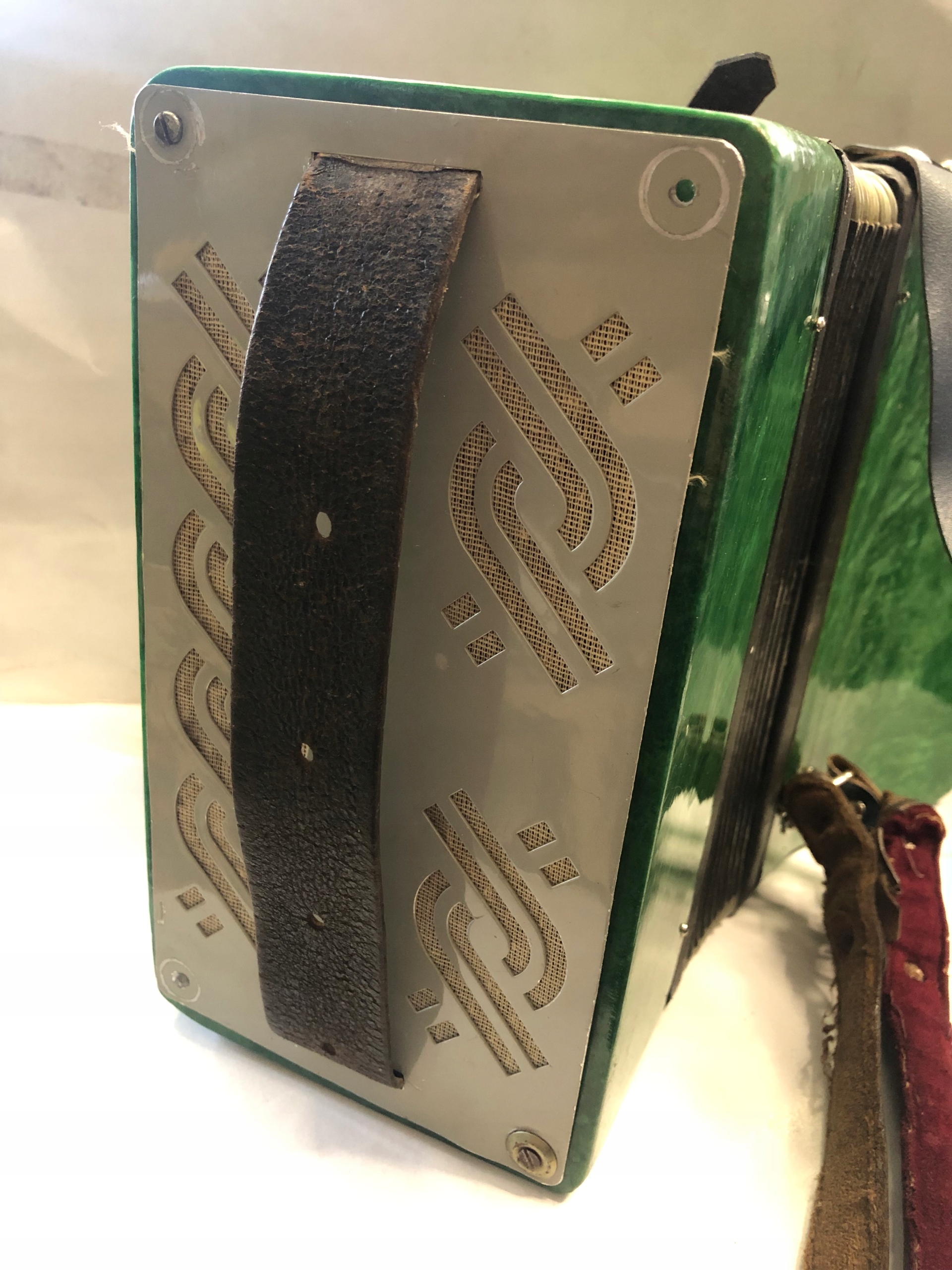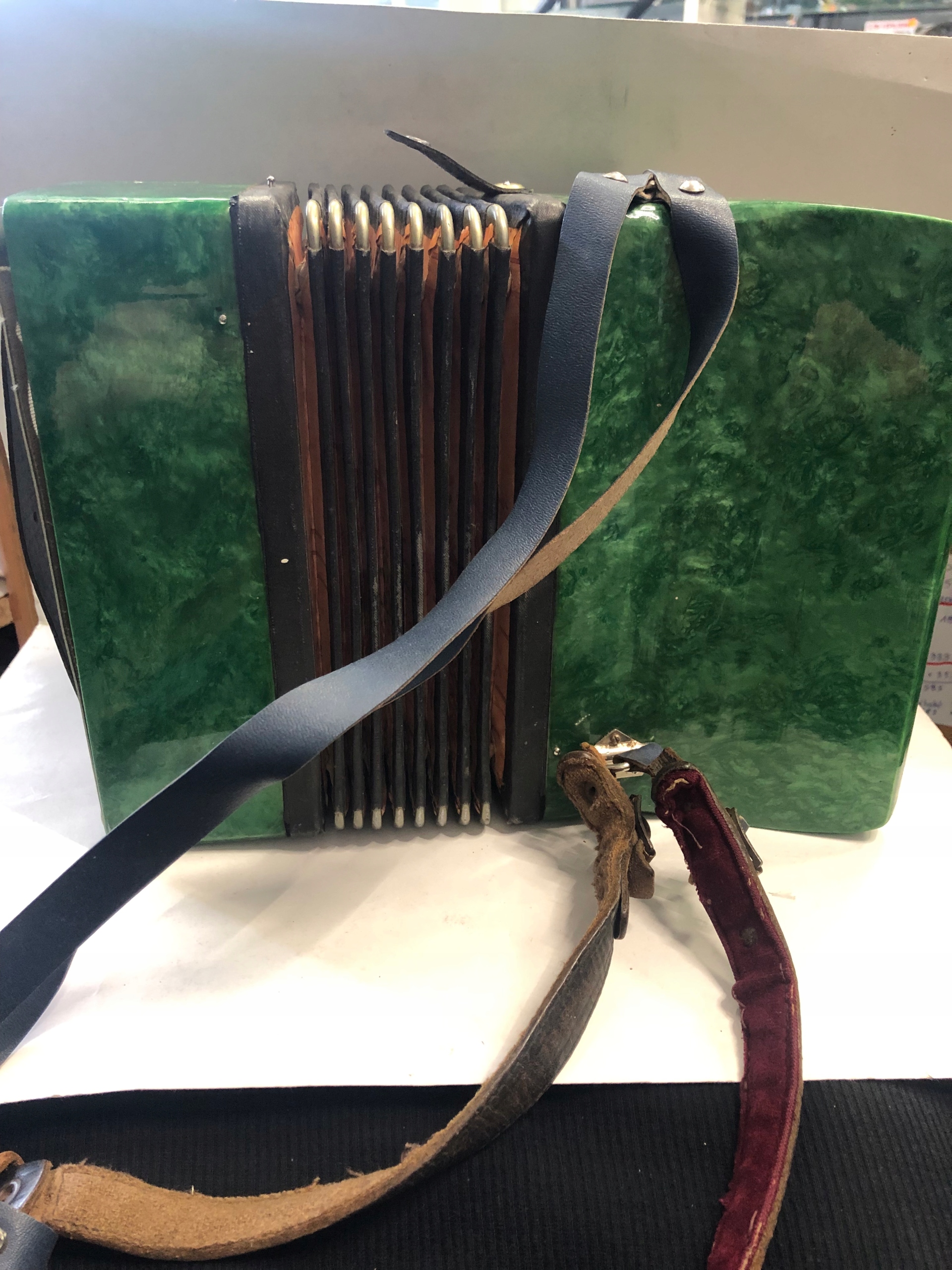 Аккордеон в хорошем визуальном состоянии состояние, есть небольшие повреждения. Не работает (не издает звук) одна клавиша отмечена на клавиатуре синей точкой и с правой стороны нет винтов, поэтому сторона торчит ( все видно на фото)