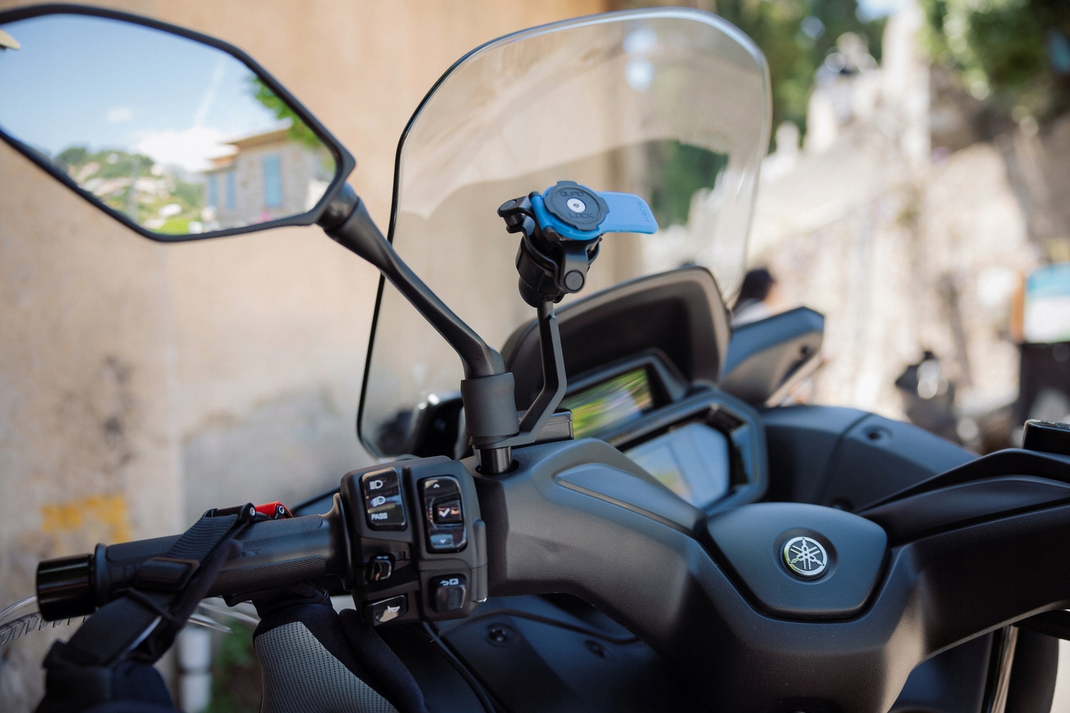 Крепления Quad Lock® под зеркалом, установленные на руле, обеспечивают неинвазивную установку на мотоцикле.
