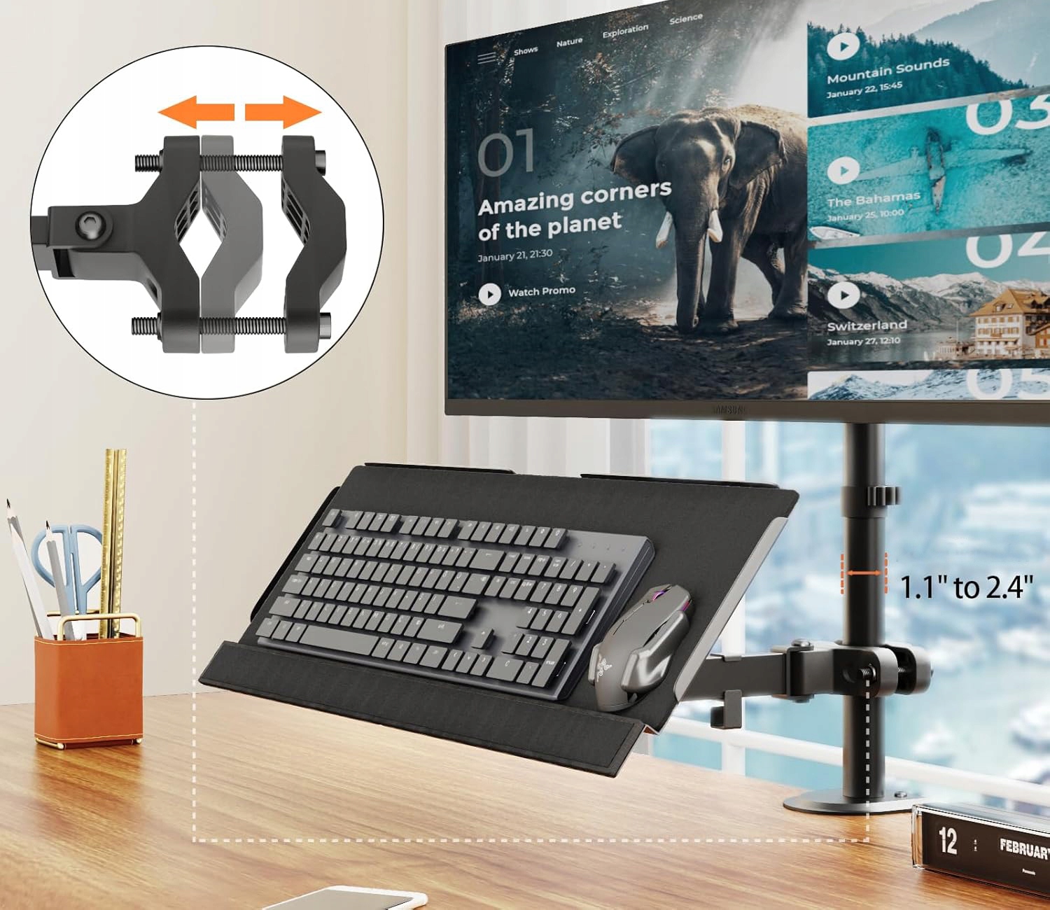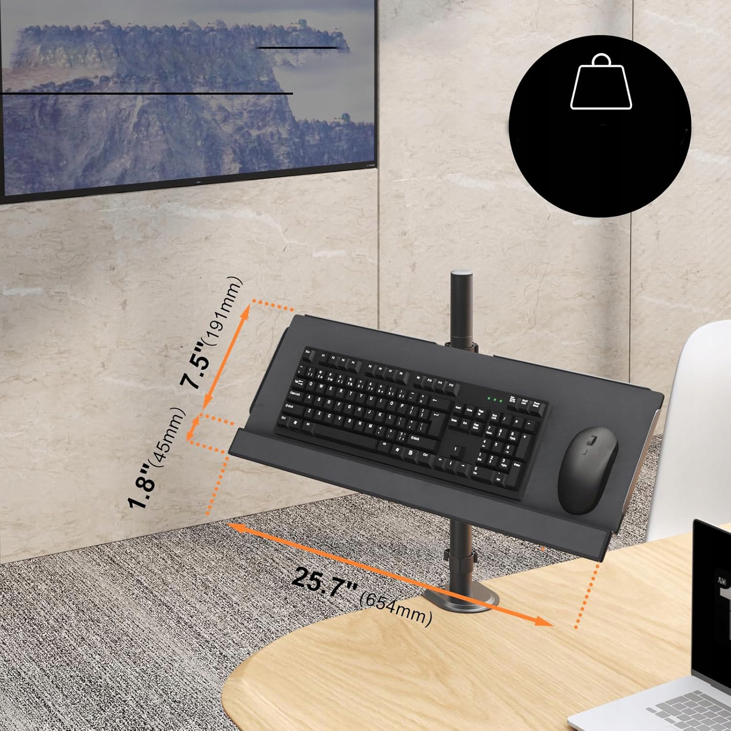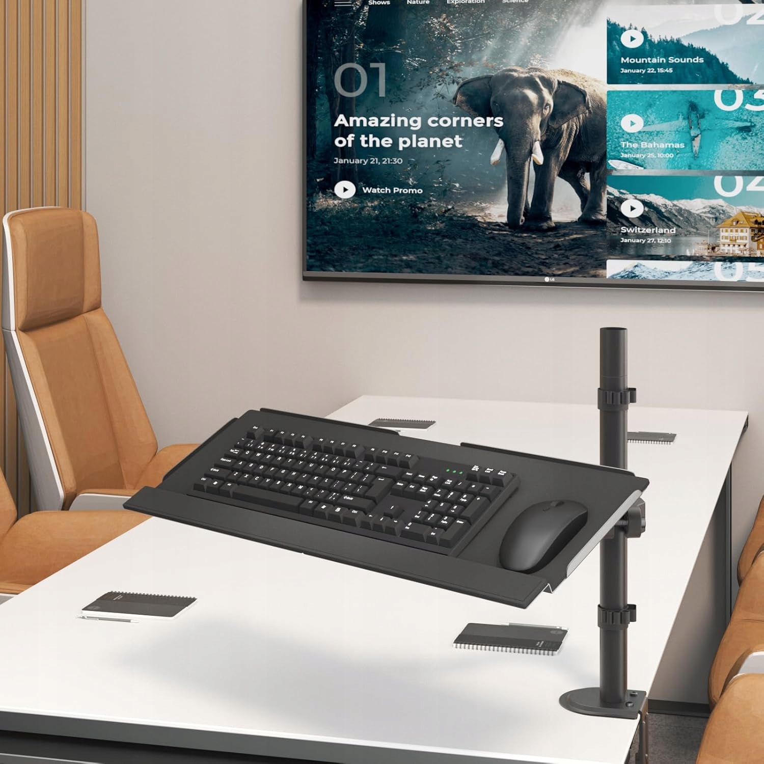 Подставка для клавиатуры, закрепленная на стойке, — идеальное решение для людей, желающих повысить комфорт и эффективность работы за компьютером. Изготовленная из прочной стали, универсальная клавиатура подходит для опор диаметром от 1,1 до 2,4 дюйма, а просторная столешница размером 25,7 x 9,3 дюйма вмещает большинство стандартных и больших клавиатур, доступных на рынке, обеспечивая при этом достаточно места для мыши. Высокие края предотвращают случайное соскальзывание клавиатуры, что повышает безопасность во время использования.
