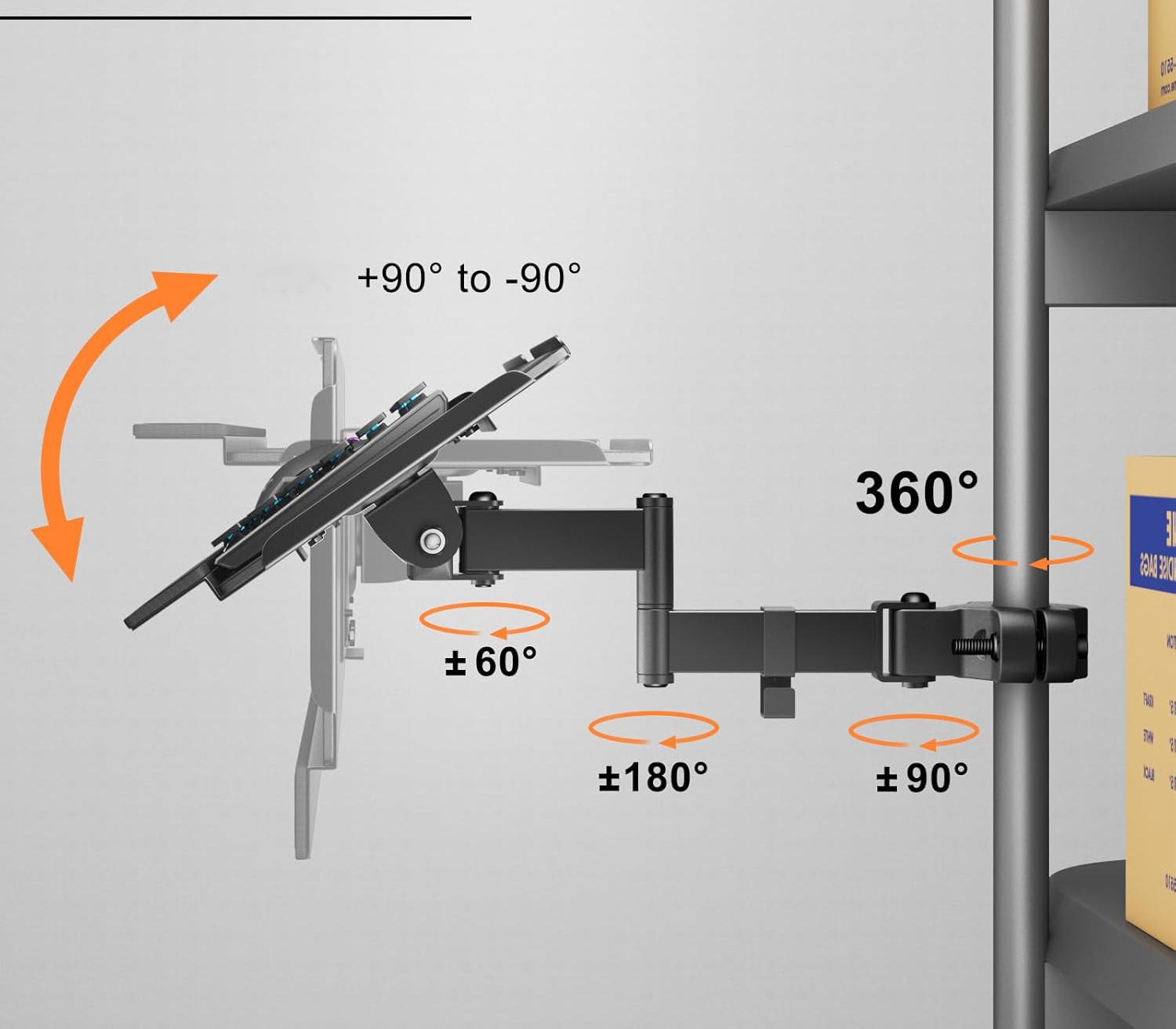 Одной из ключевых особенностей этого продукта является возможность полной настройки. Благодаря двум шарнирным рычагам клавиатуру можно регулировать в диапазоне от +90° до -90°, что снижает боль в запястьях и мышечное напряжение. Кроме того, крепление на стойке обеспечивает поворот на 360 ° и полное выдвижение 10,6-дюймового рычага, что обеспечивает удобные углы обзора и гибкость регулировки положения при наборе текста на клавиатуре.