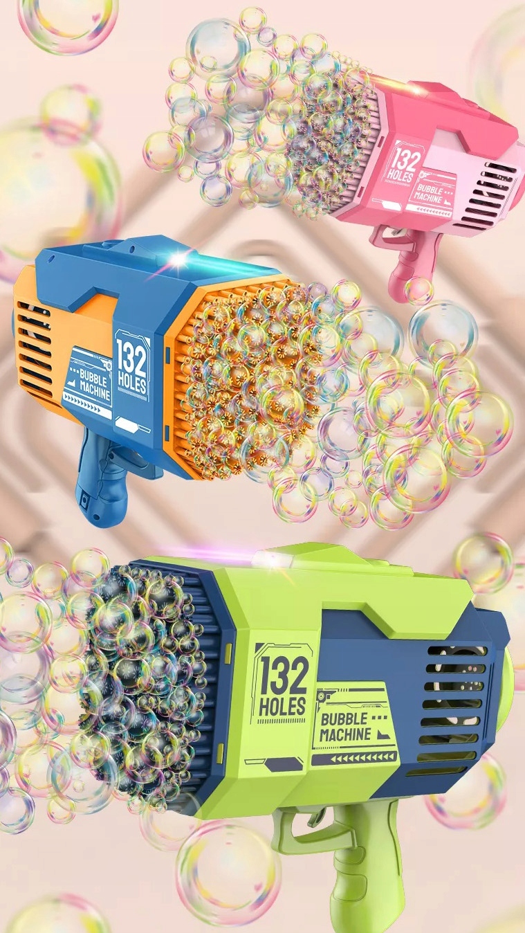 Удивительный пистолет для производства мыльных пузырей, который при нажатии выпускает множество мерцающих пузырей. нажмите на спусковой крючок.