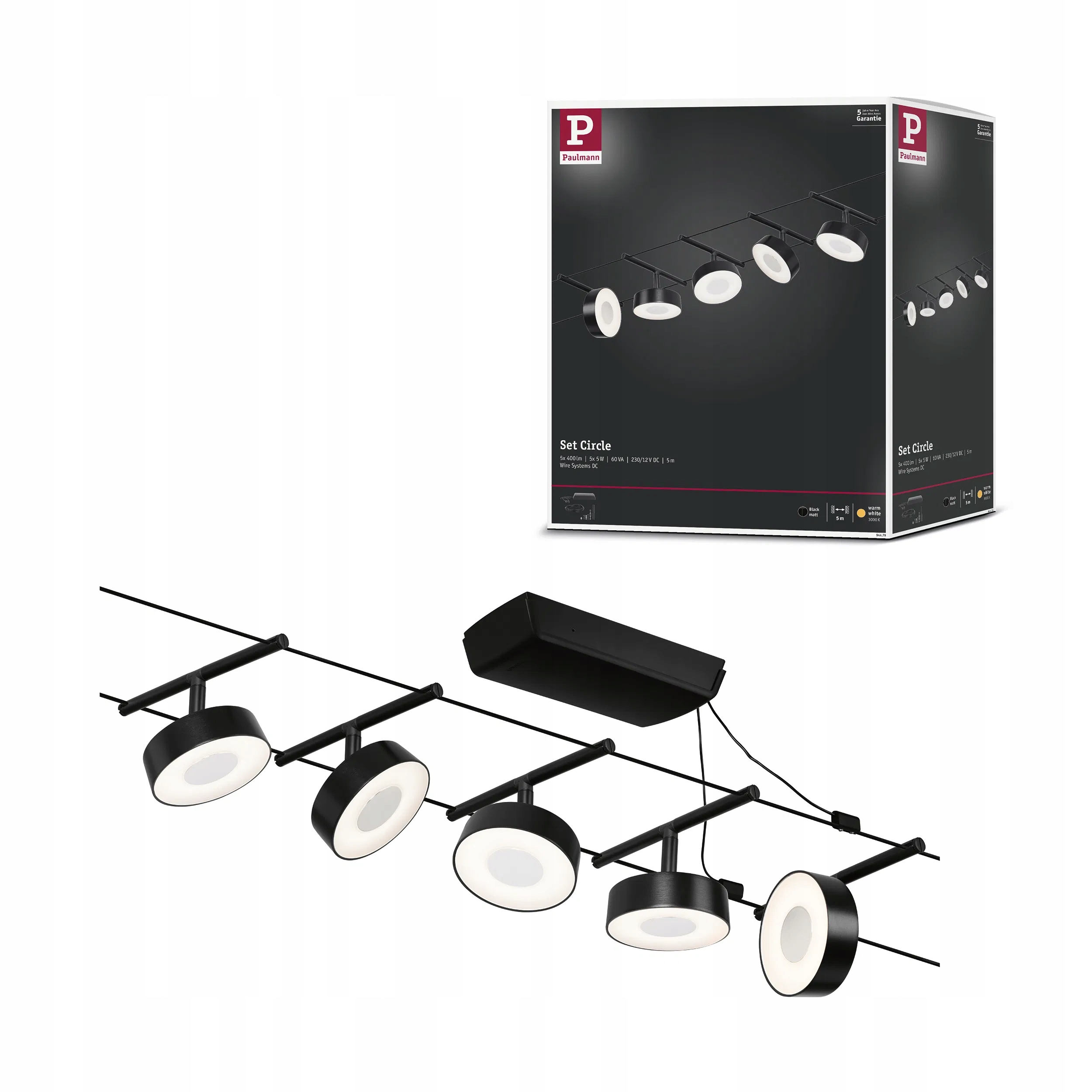 Серия Circle матового черного цвета с 5 светодиодными спотами может быть установлена на стене или потолке, что открывает неограниченные возможности дизайна. Будь то прямые, наклонные или угловые – кабельные системы подходят для любого помещения и являются идеальным решением проблемы в сложных условиях монтажа. Базовый комплект можно дополнить отдельными спотами, дефлекторами и другими аксессуарами. Кабель длиной 10 м можно разделить посередине, чтобы систему можно было подвешивать макс. расстояние 5 м. Система обеспечивает оптимальное распределение света и может быть легко расширена, если требуется больше освещения. Для распределения светильников по помещению необходима всего одна розетка. В системах с технологией 12 В постоянного тока нельзя затемнить яркость с помощью настенного диммера.
