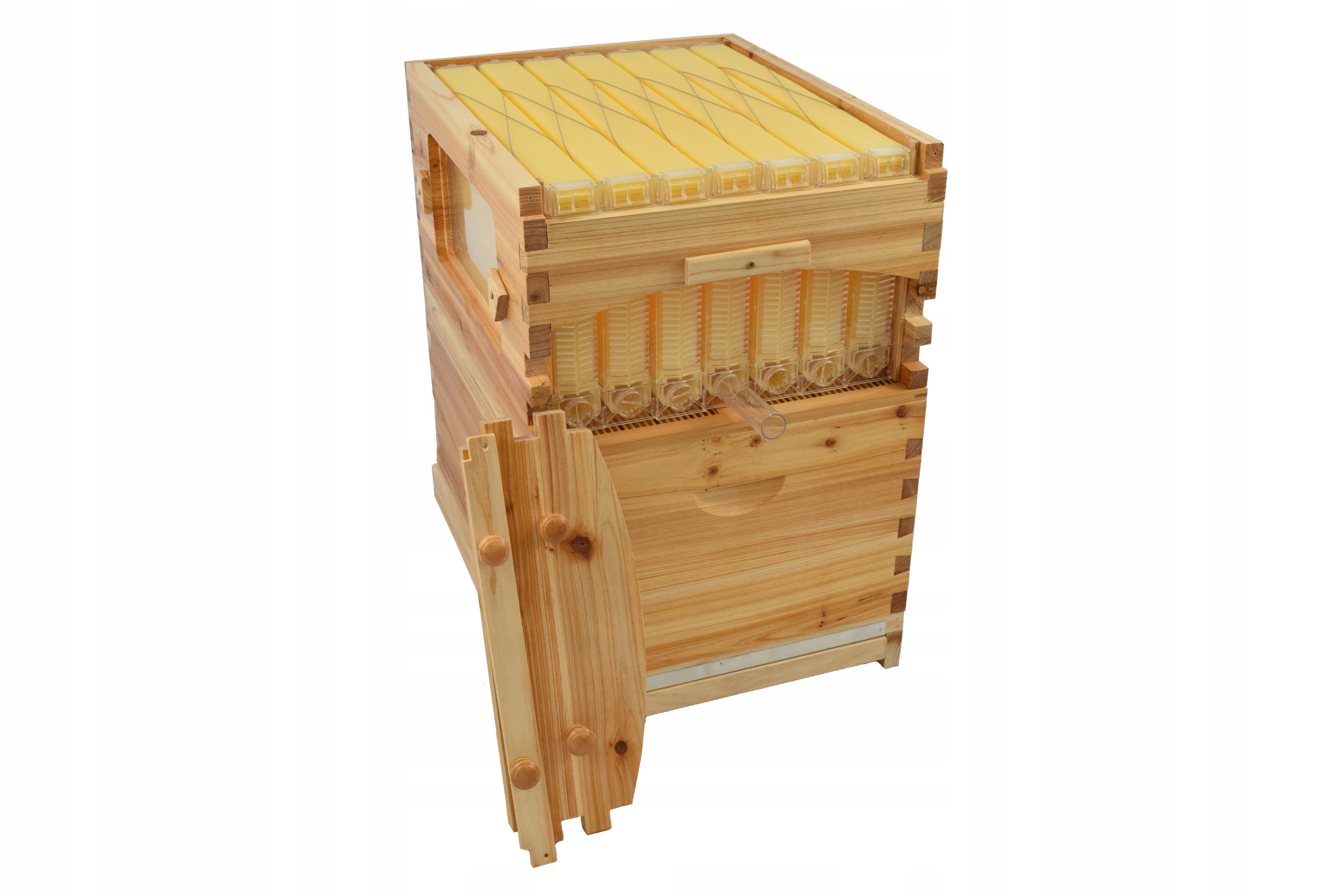 В этом улей при сборе меда пчелы не беспокоятся, потому что вы можете получить мед, не открывая улей. Легкое вращение рукоятки и, следовательно, к потоку плавного рамки улья нарушает местоположения ячеек, а затем тяжесть заставляет мед течь вдоль ячеек приготовленных контейнеров. После вращения медовой ячейки восстановите ручку в их исходное положение, и пчелы снова начнут заполнять клетки меда.