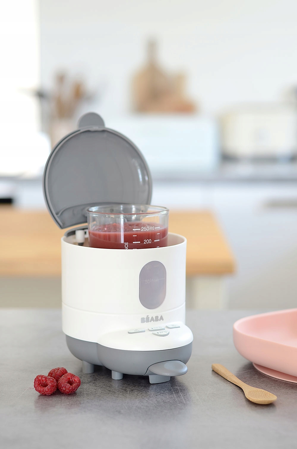 Bib'Expresso ® — устройство 2-в-1 для приготовления еды от французского бренда BEABA. Он позволяет быстро приготовить молоко для малыша, используя всего лишь одну руку (каждая мама знает, насколько практично это решение). По форме техника напоминает кофемашину (отсюда и название), но она более эргономична, компактна и удобна в хранении. В верхней части находится емкость для нагрева воды с практичным окошком для наблюдения за ее уровнем. Воду можно нагреть до комнатной температуры, т. е. 22°С, или до температуры тела, т. е. 37°С. Затем просто поместите под нее бутылочку с рассыпчатой молочной смесью, нажмите кнопку, и в бутылку нальется вода правильной температуры, так что еда после смешивания сразу станет готов к употреблению. Это гарантирует система Direct Water Control®.