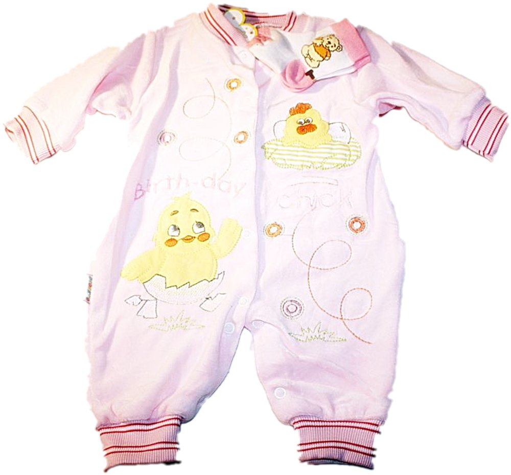 Удобный розовый комбинезон с длинными рукавами. Цыплята пришиты к комбинезонам. Низ штанины 7/8. Носки в комплекте.