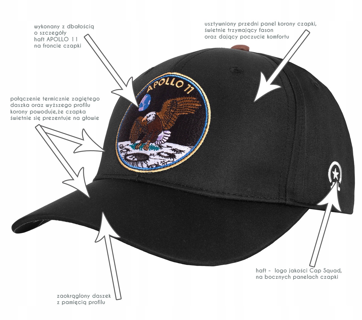 - вышивка APOLLO 11 на передней части кепки, сделанная перед пошивом - полностью закрыта внутри