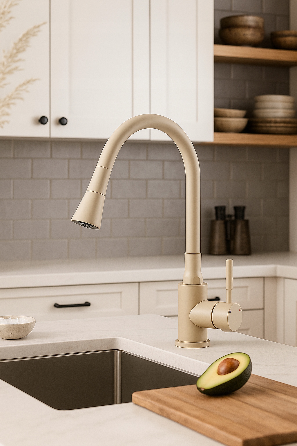 Бежевый кухонный кран, стоящий на раковине эластичный кухонный кран
