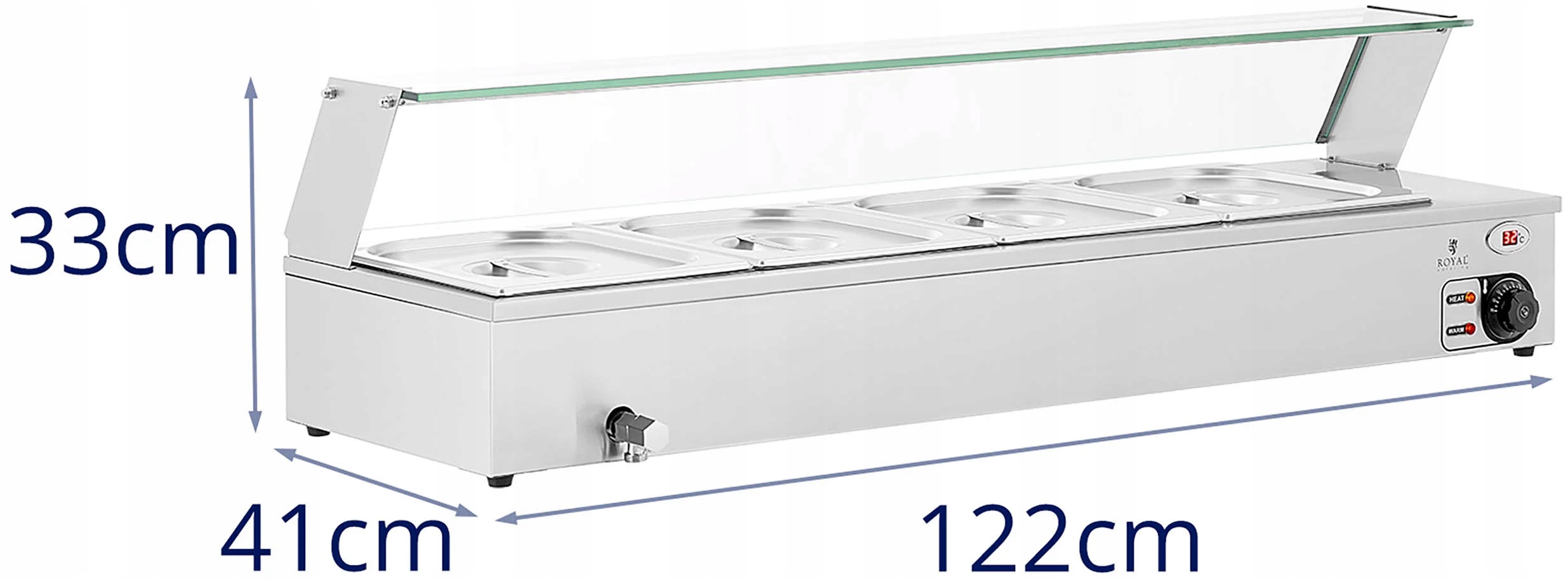 Эффективный нагревательный элемент мощностью 2000 Вт быстро нагревает воду до желаемой температуры. Включить автоматический термостат можно с помощью ручки, позволяющей точно регулировать температуру в диапазоне 30-110°С. Крышка из закаленного стекла защищает продукты от загрязнения. Это помогает поддерживать температуру и в то же время обеспечивает отличную презентацию. Сливной кран позволяет легко наполнять, опорожнять и очищать оборудование.
