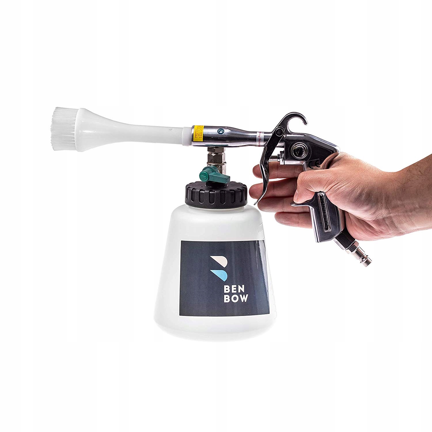 - Пистолет, благодаря насадке специальной формы с вращающимся сердечником сжатый воздух производит пенистый раствор, который очищает все элементы, слегка смачивая их.