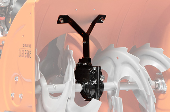 Усиленная коробка передач с двумя дополнительными опорами передает до 95% крутящего момента двигателя. Срезные болты на червяках защищают коробку передач от перегрузки. Выходной вал коробки передач установлен на подшипниках большого диаметра, что обеспечивает высокую устойчивость механизмов к вибрациям и ударам.