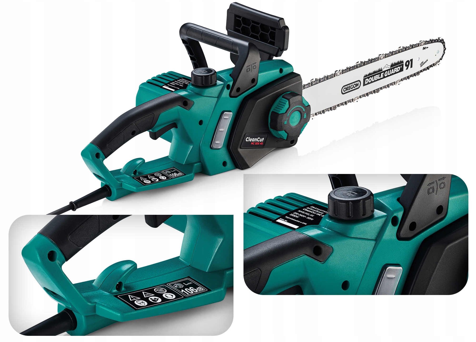 Высокая мощность | 2300 Вт | Длинная направляющая 40 см | Путеводитель по Орегону | Сеть ОРЕГОН | Энергосбережение | Простая сборка | Автоматическая система смазки цепи | Система натяжения цепи без инструментов | Аварийное торможение |