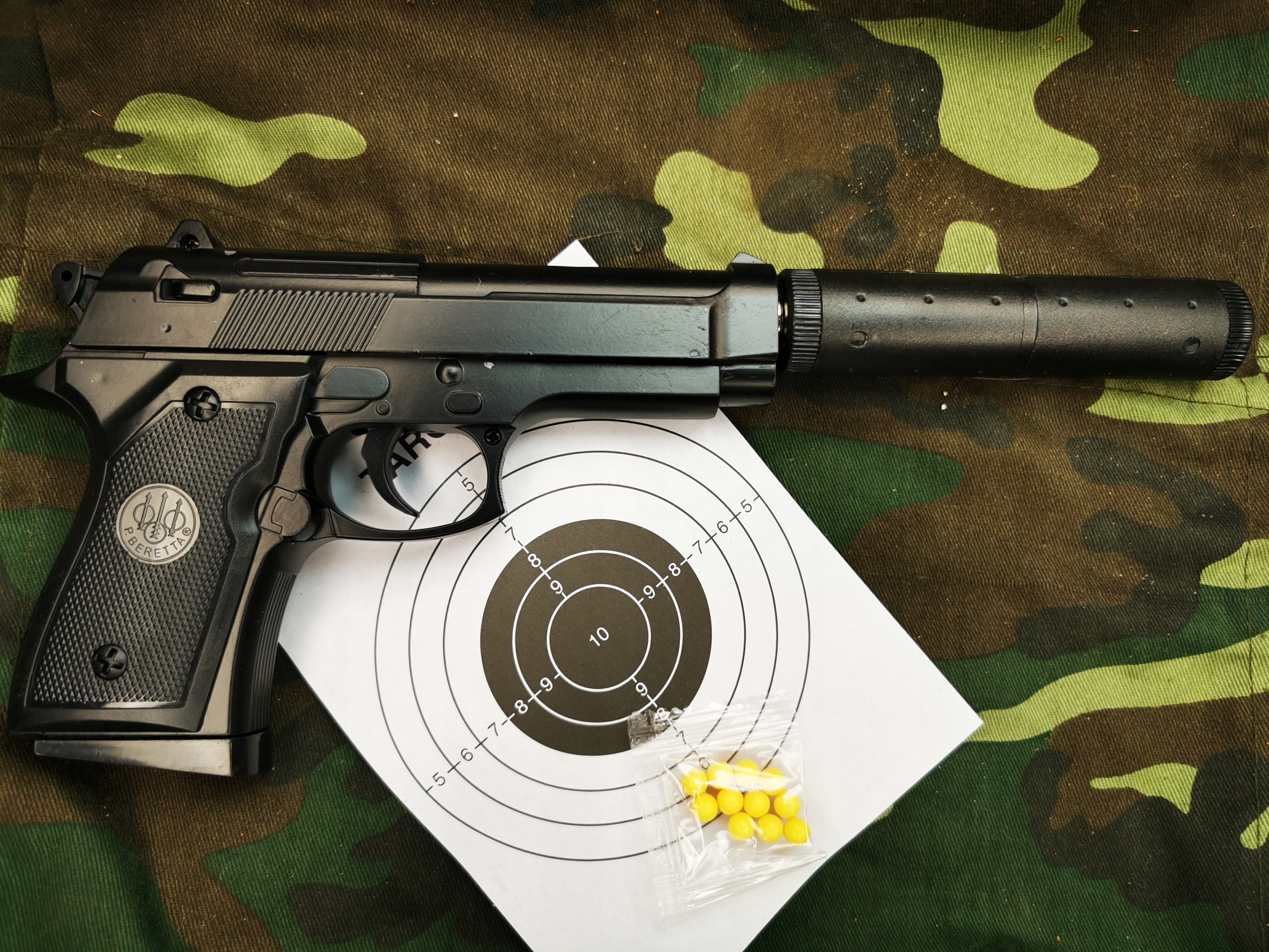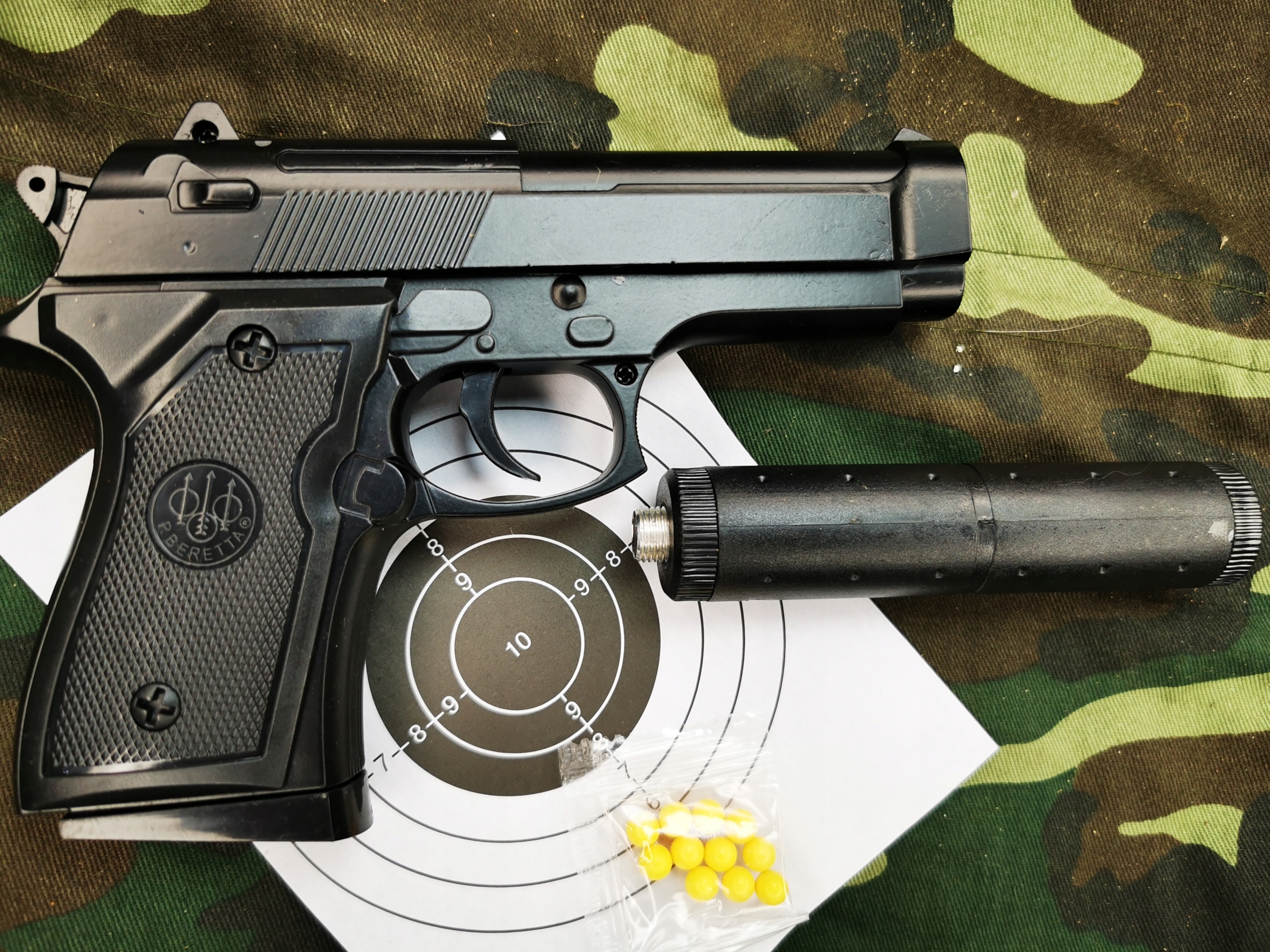 В комплект входят: пистолет с магазином, глушитель, пачка около 10 шариков, картонная упаковка, инструкция по эксплуатации, стрельба по мишени