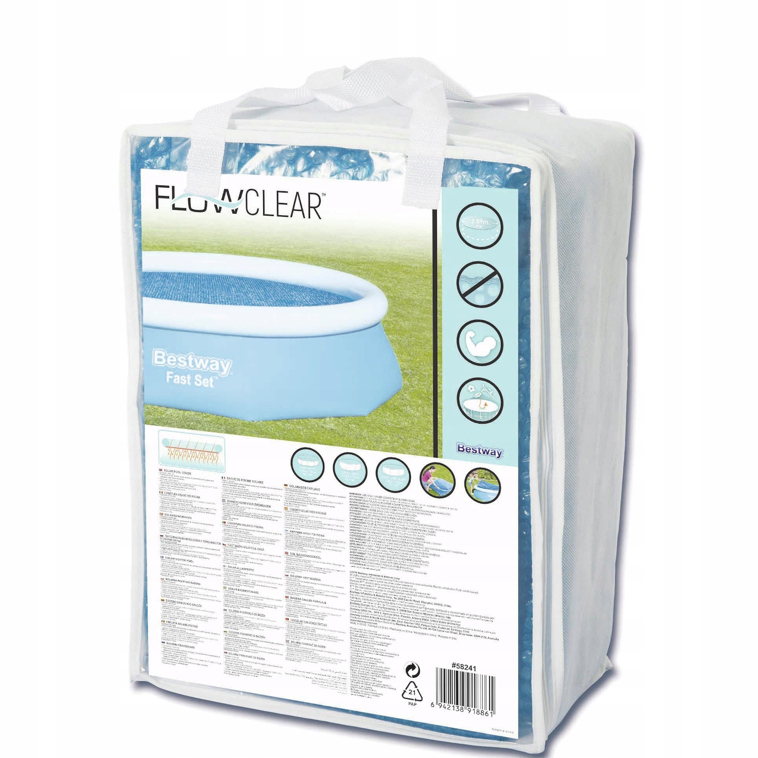 Солнечная крышка диаметром ок. 289 см , Предполагается до Pools расширения и рамки с размером размером около 305 см. изготовлен из прочного и устойчивого материала PE. Благодаря использованию солнечной энергии, покрытие поддерживает температуру воды в бассейне и предотвращает тепло. В то же время он имеет традиционную защитную функцию, сводя к минимуму количество загрязнения, падающего в воду. w set Существует также портативная сумка.